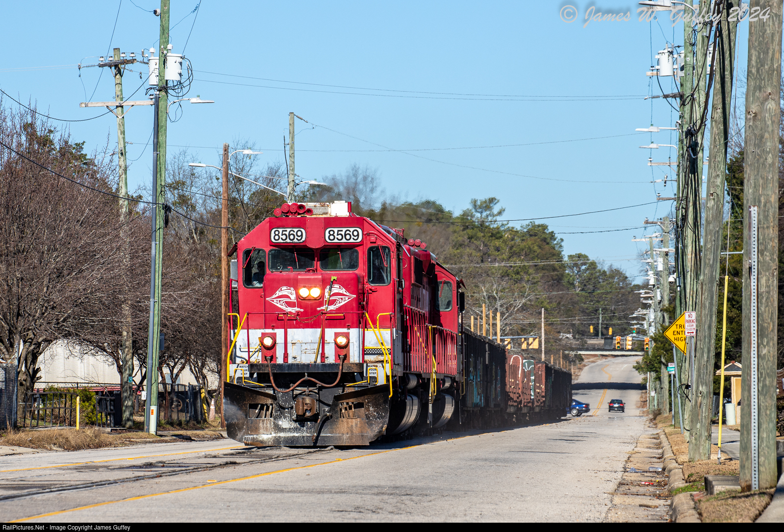 | RJ Corman's Raleigh and Fayetteville Railroad train crawls down Hillsboro Street as they enter Fayetteville and head toward the interlocking at A&Y Crossing, where they will cross CSX's A-line and proceed to drop the cars for interchange to the Aberdeen and Rockfish. The cars were spotted at River Terminal just a couple hours later. |