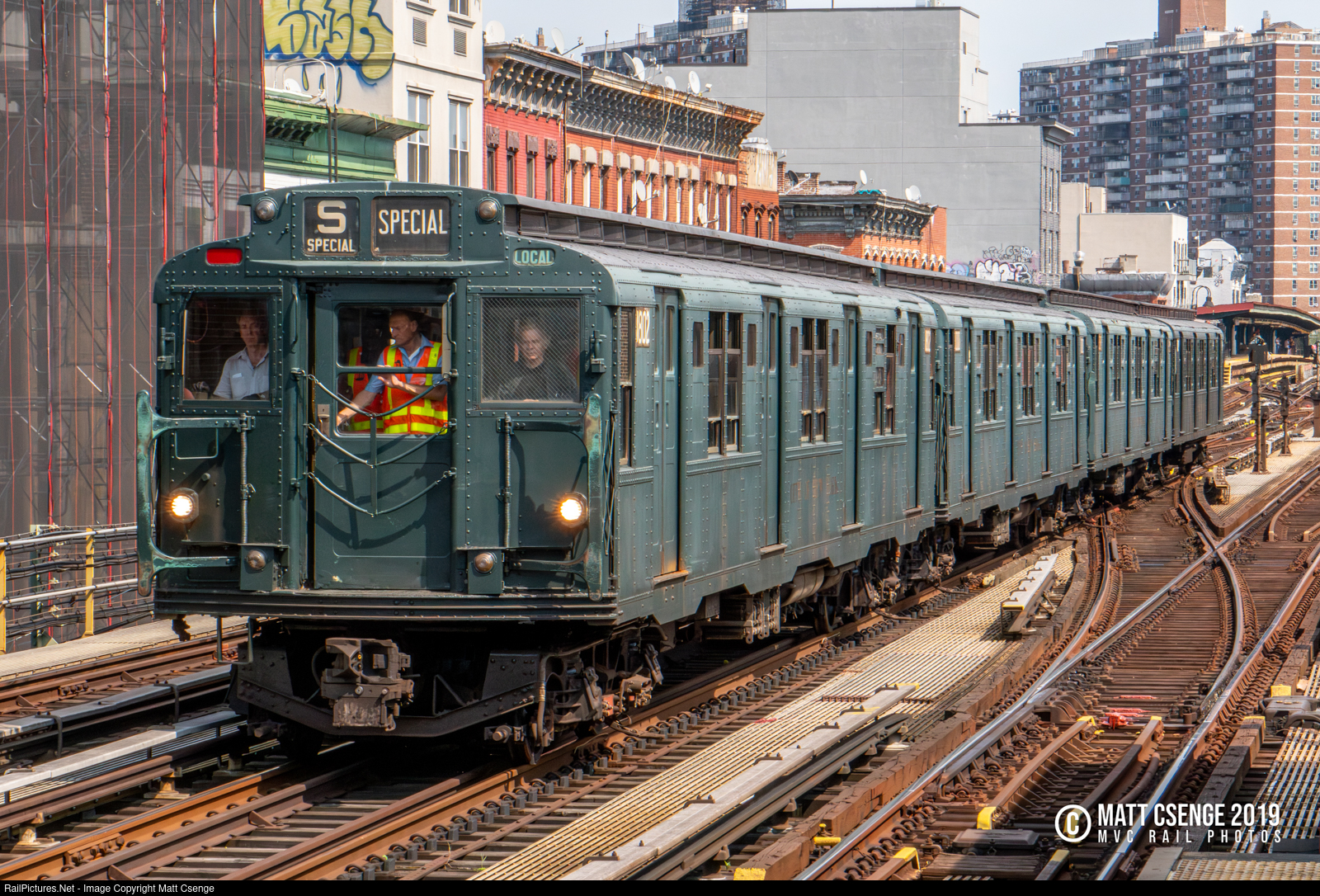 The NY Transit Museum's train of R1-9 "Arnines" pulls into the pocket track at Marcy Avenue Station on the BMT Jamaica Line, led by R9 car 1802. This day's nostalgia ride included a run on both the Jamaica and Myrtle Avenue Lines, with the BU gate cars running a few round trips on the express track between Myrtle Avenue and Marcy Avenue stations. The Arnines tucked into the pocket track to clear the track for the gate cars. |