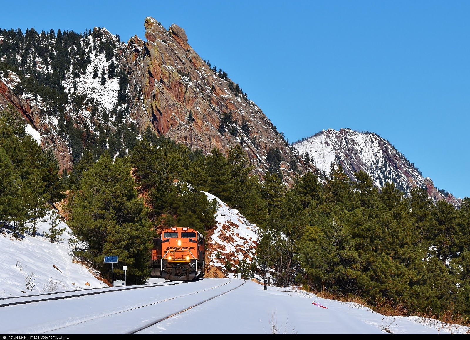 BNSF 9083 (SD70ACe) leads a freight through Rainbow Cut and past the Bouler Flatirons as it heads to Denver on the Moffat Tunnel Sub.