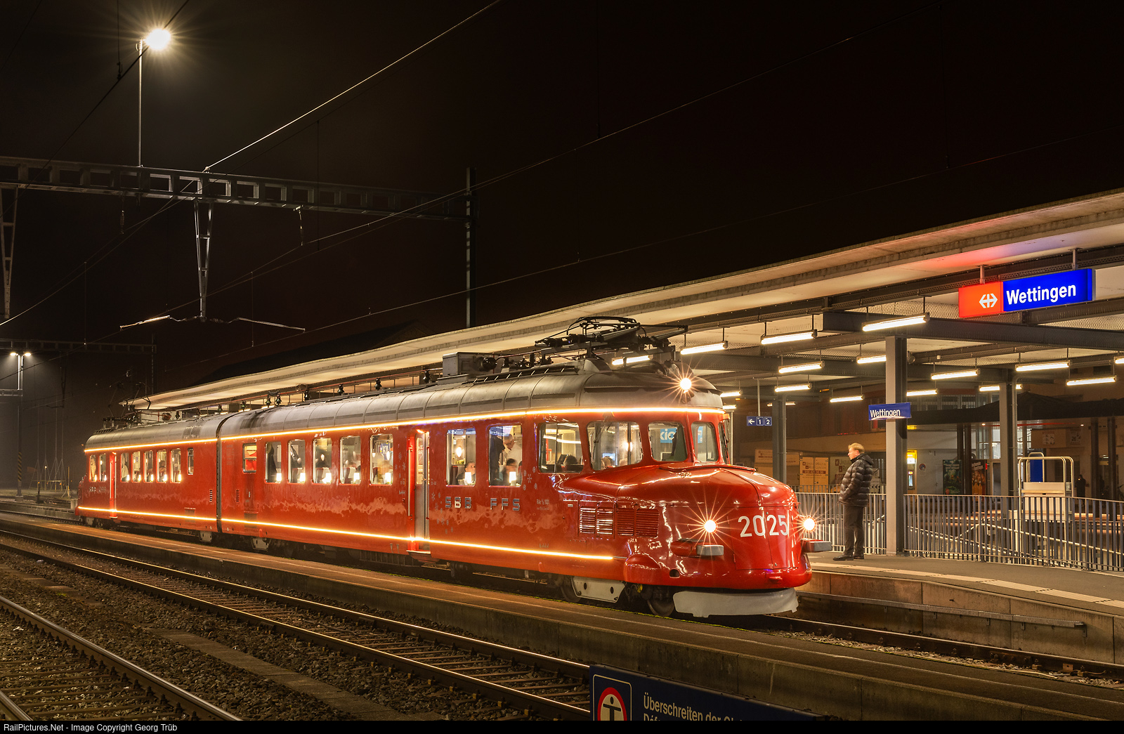 Happy new Year! The SBB's “Churchill Arrow” RAe 4/8 # 1021 is on its traditional New Year's Eve trip and is standing on track 1 in Wettingen. The trip runs from Zurich main station via Zurich Oerlikon-Regensdorf to Wettingen, then via Dietikon-Zurich Stadelhofen-Meilen-Rapperswil-Pfäffikon SZ to Wädenswil to welcome the New Year, and back to Zurich main station.