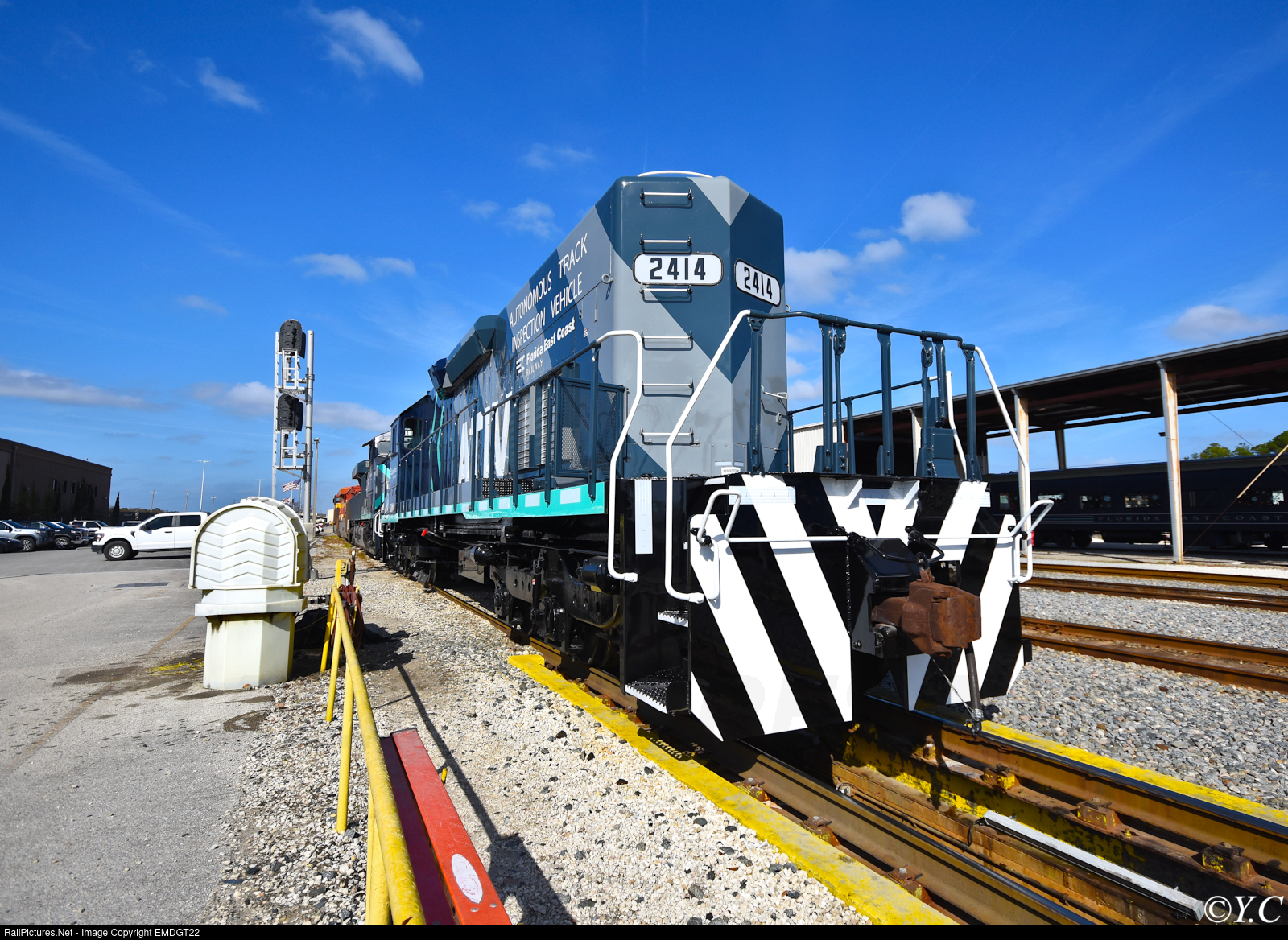 FEC's new Autonomous Track Inspection Vehicle rests at Bowden Yard. This unit was developed from SD40-2 #719 at the railroad's New Smyrna Beach shops and eliminates the need to contract Norfolk Southern's track geometry train.