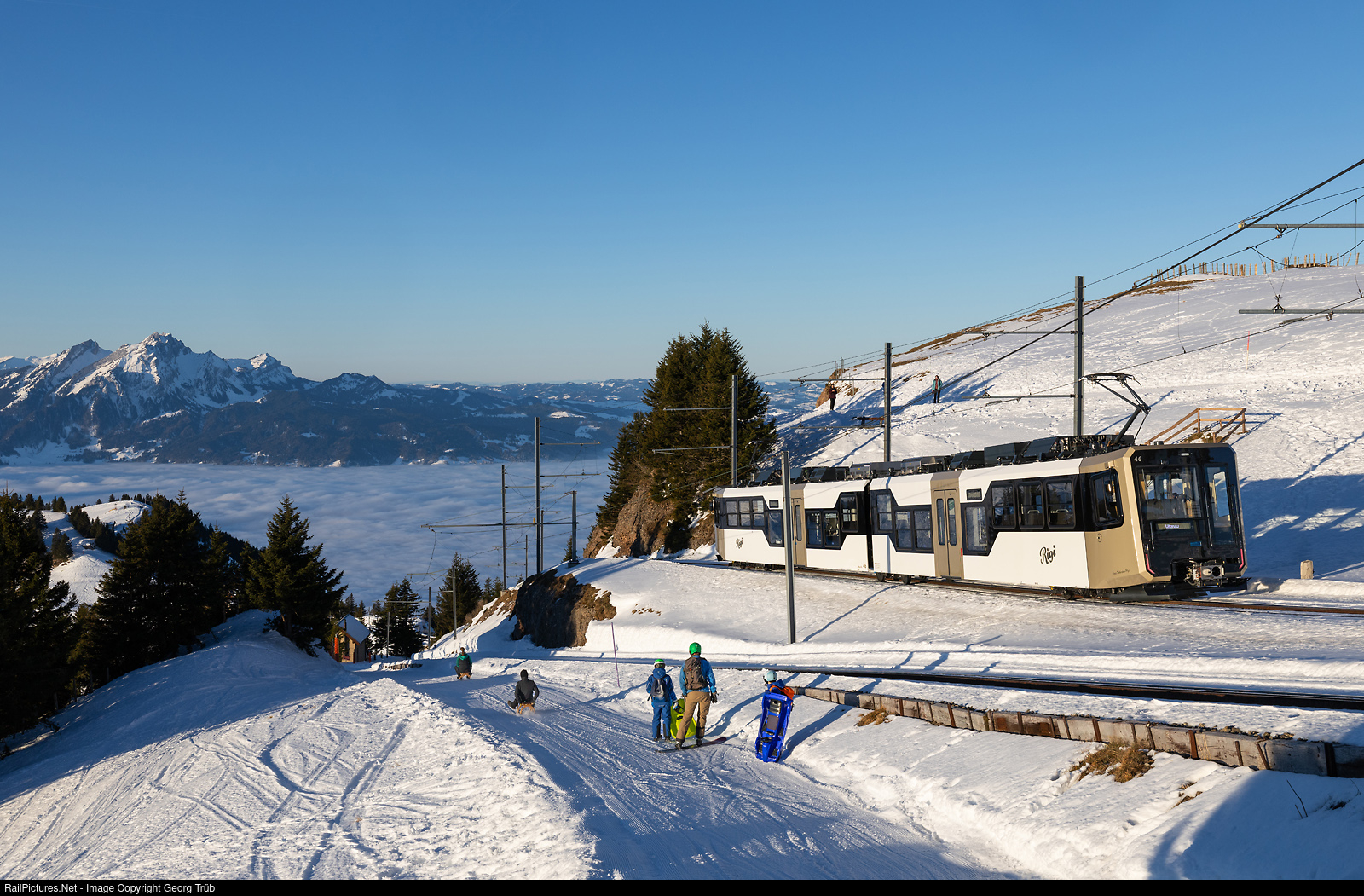 | Perfect conditions on the Rigi, Queen of the mountains, with sun, snow and blue sky. As first train from Vitznau came the articulated Bhe 4/6 # 46 to Rigi Kulm, and is now going down as train 1108 of the line CC82 back to Vitznau in the fog. The well prepared sledge run is just beside the tracks of the Rigi Bahnen. On the left is Pilatus mountain. |