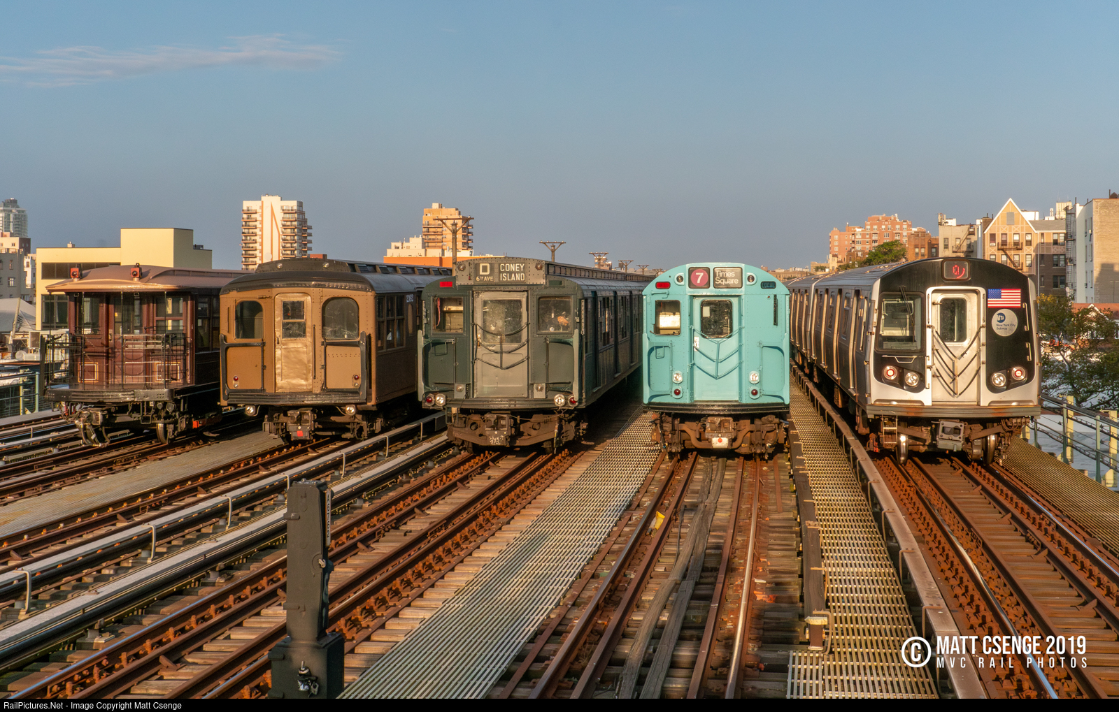 On September 28, 2019, the NY Transit Museum hosted its annual Parade of Trains event on the BMT Brighton Line. In keeping with tradition, the four trains were lined up at Ocean Parkway after the event concluded on Saturday. From left to right: Brooklyn Union Elevated gate car 1407 (Pressed Steel Car Co., 1907), BMT AB Standard car 2392 (ACF 1914-1919), R1 "Arnine" car 100 (ACF, 1930-1931), R33WF car 9308 (St. Louis Car Co., 1963), and a passing R160A Q train (Alstom, 2005-2010). The R33WF train also included two R38 cars (St. Louis Car Co., 1966-1967), which were used for boarding since there was a large gap between the IRT-width R33WFs and the BMT-width platforms.