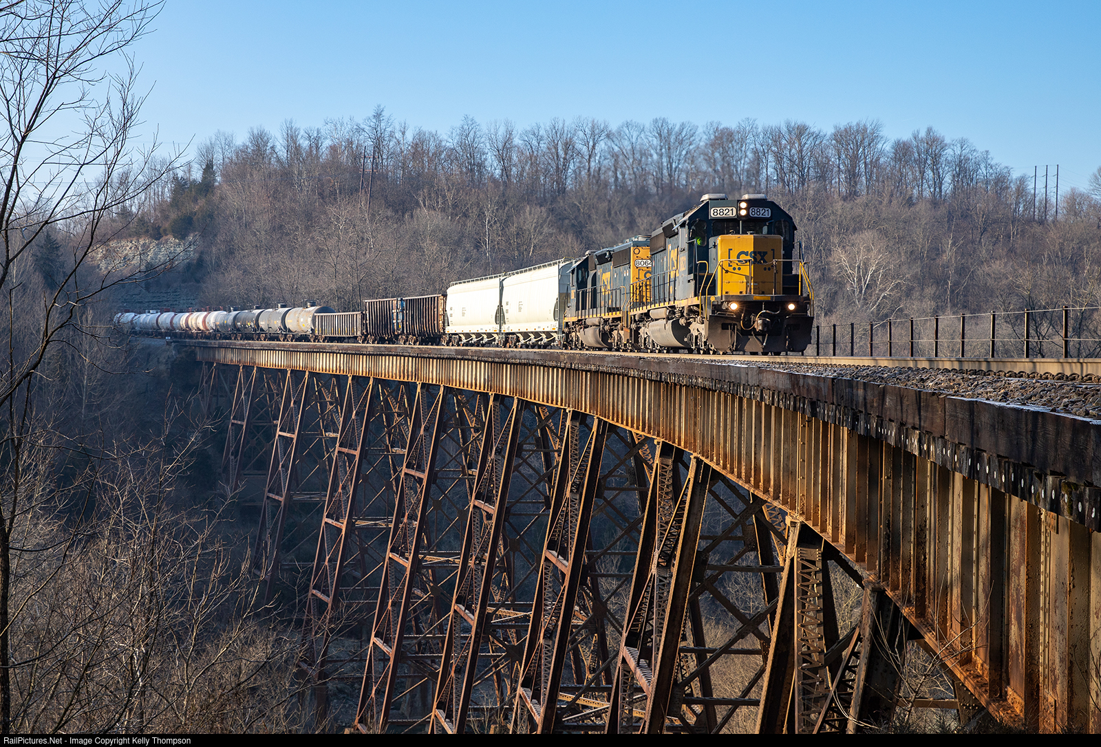 | CSXT 8821 lugs J767 towards Queensgate, flying over the unique Independence Trestle. The trestle overwhelms the tiny Banklick Creek below. |