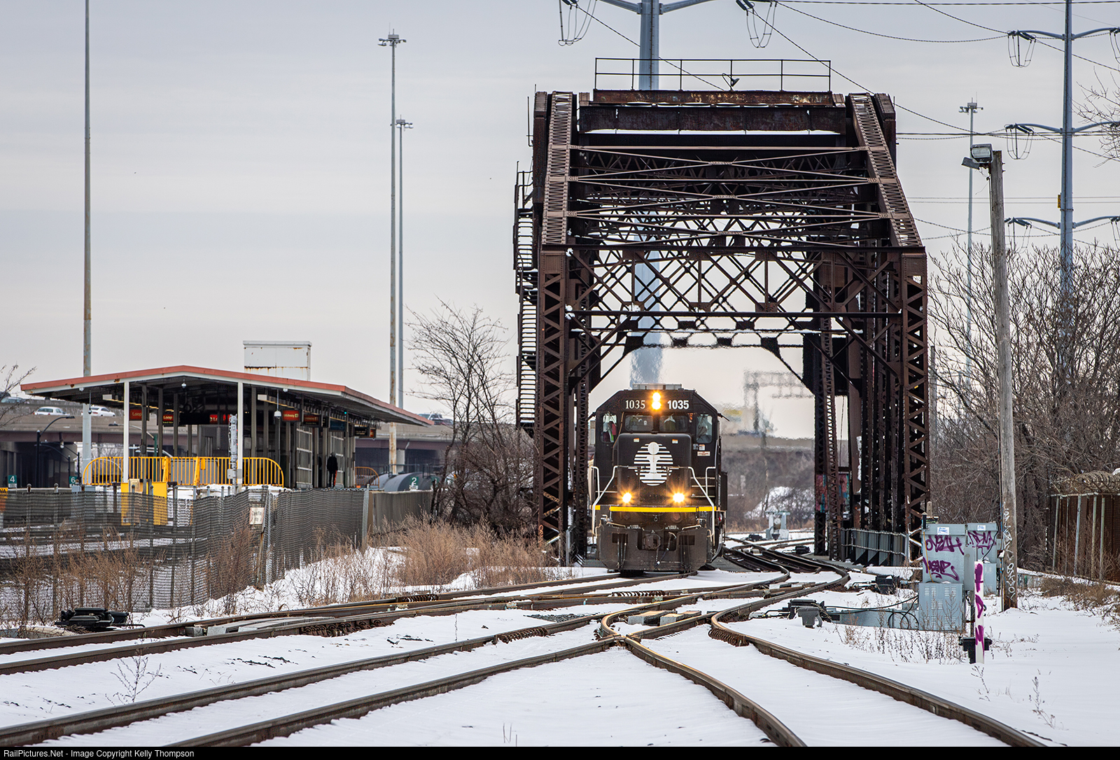 | CN L536 gets its journey started and crosses the bridge over Bubbly Creek. This bridge was built in 1906 for the Chicago and Alton RR. To the left is CTA's Ashland stop on the orange line. |