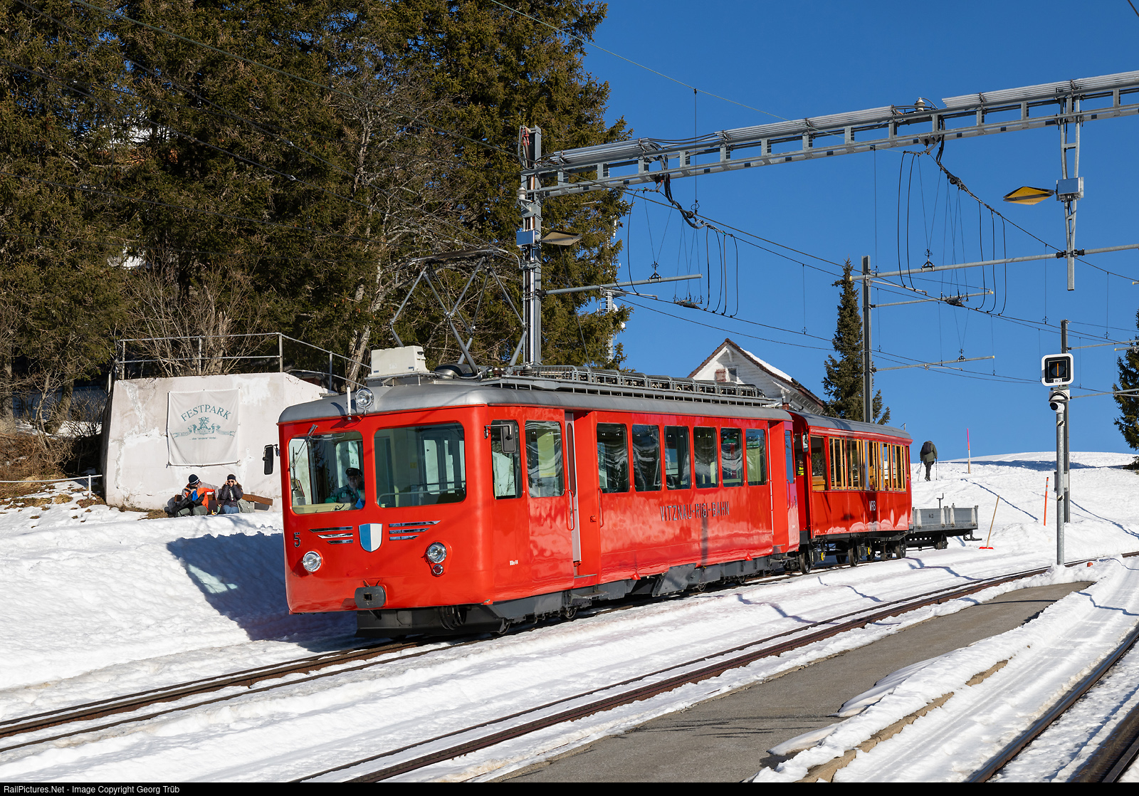 Perfect conditions on the Rigi, Queen of the mountains, with sun, snow and blue sky. Cogwheel railcar BDhe 4/4 # 5, built in 1964 for the Vitznau-Rigi-Bahn with car B # 1 built 1871 ! and small freight car Kk # 22 for sledges and skis was relief train this day, in addition to the timetabled trains. The train is entering Rigi Staffel, coming from Rigi Kulm.