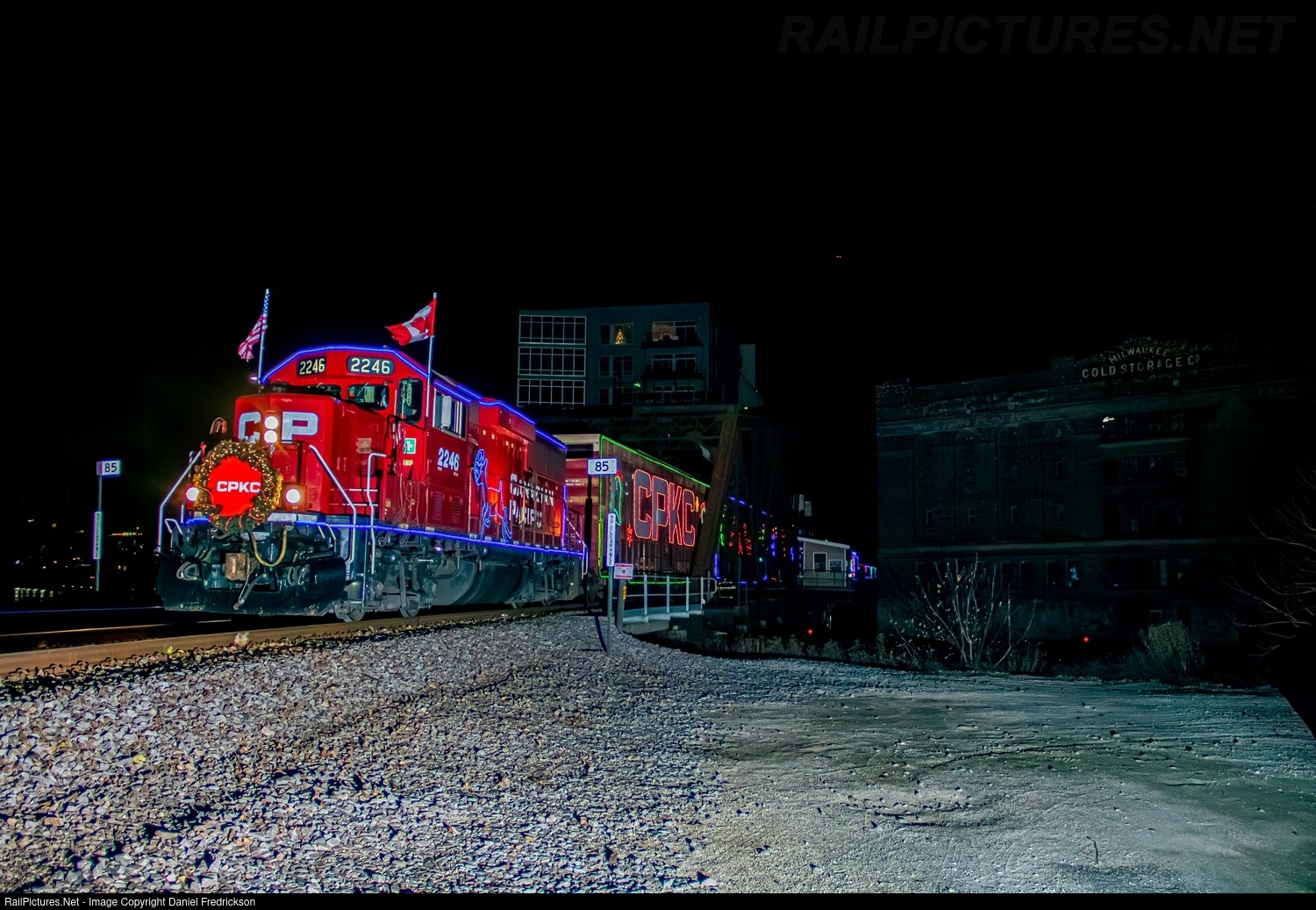 It's the second year for the CPKC Holiday Train since the merger in 2023, and for the first time, the train's consist has been slightly altered to replace the "Canadian Pacific" script lettering on the boxcars with the new "CPKC" logo. Other than that, the trainset presses on as usual, holding its Christmas-themed concerts and canned food drives in communities across the CPKC system. Here, the train arrives in downtown Milwaukee, WI, crossing the Menomonee River into Milwaukee Intermodal Station to drop off some of its passengers before tying up for the night.