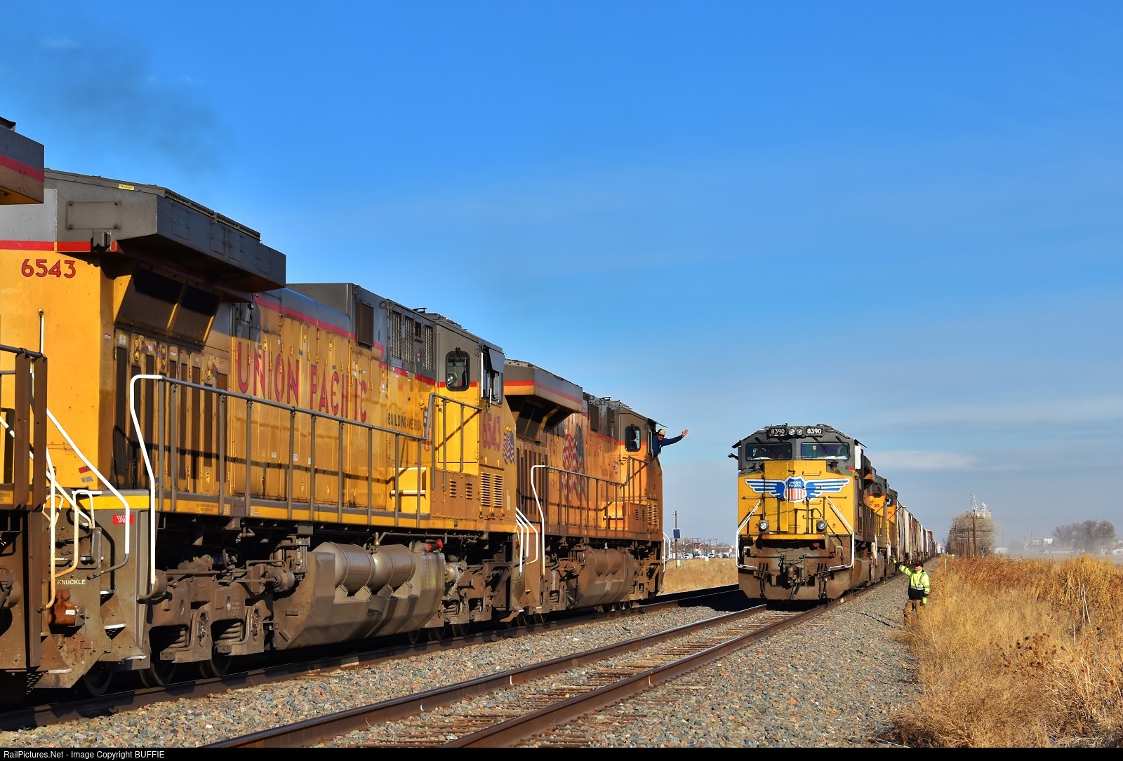 | Two Union Pacific freights meet at Platteville, Colorado, with each crew member giving a wave.