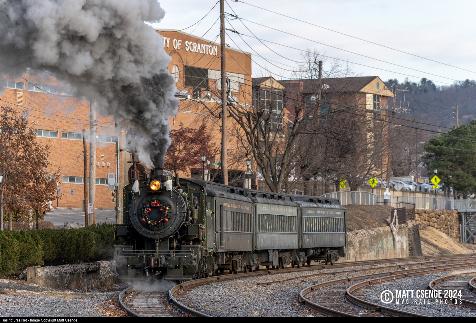 Baldwin Locomotive Works 0-6-0 no. 26 is seen steaming past the University of Scranton campus while operating a North Pole Limited service from Steamtown.