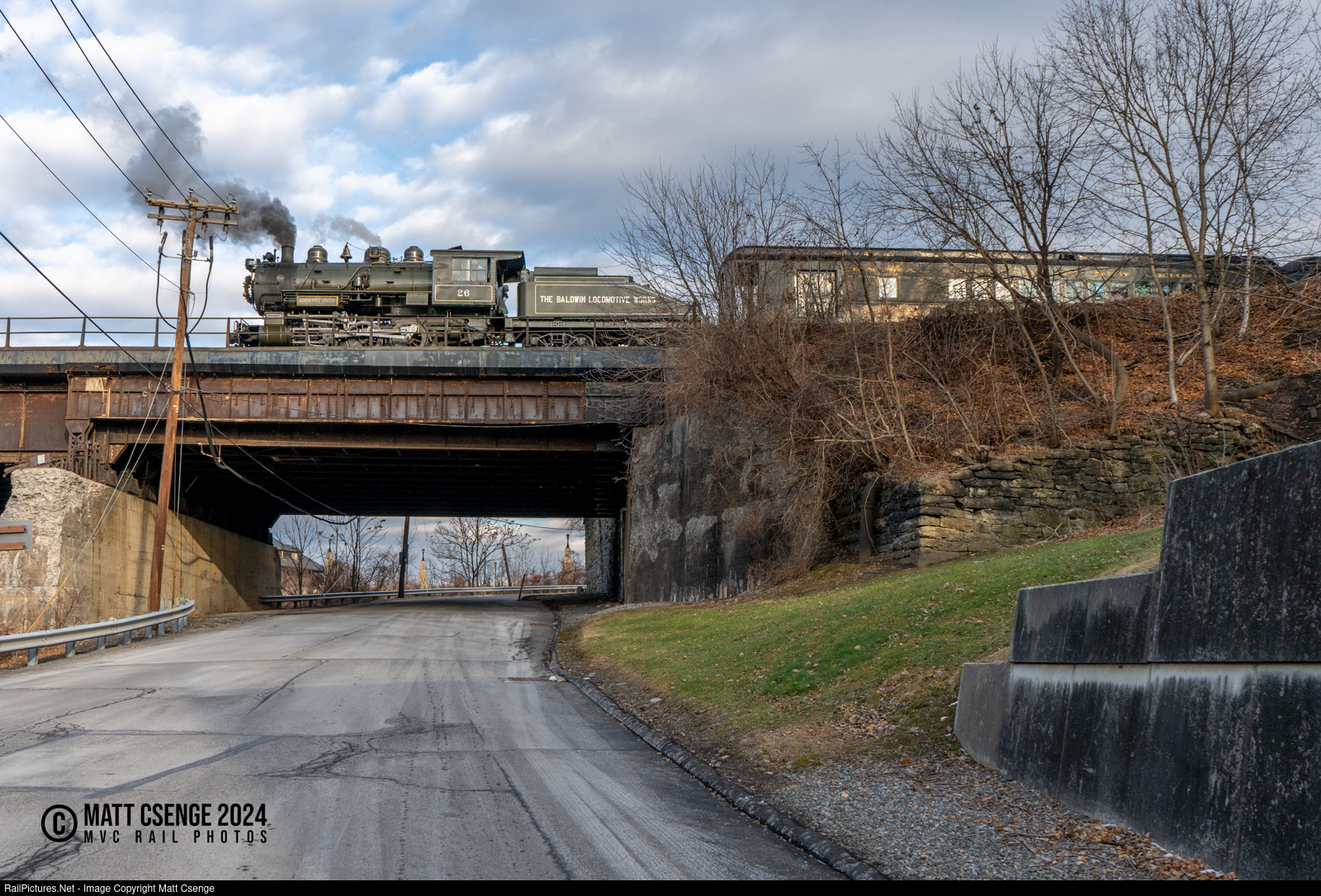 Baldwin Locomotive Works 0-6-0 no. 26 is seen crossing Bridge St while operating a
