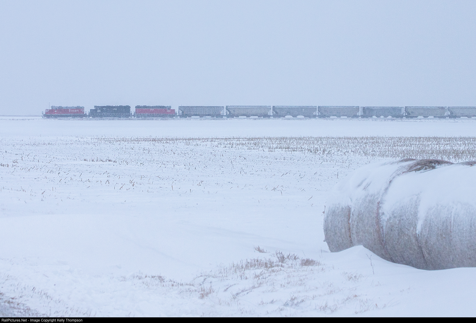 | Looking across the frozen farm fields we get a view of the full lash up on today's Bloomer train. BLOL 7591 leads south with a duo of leaser GP's trailing. LTEX 3802, the engine sandwiched, is referred to as Black Betty by railfans as she sticks out like a sore thumb in all red Bloomer consists. |