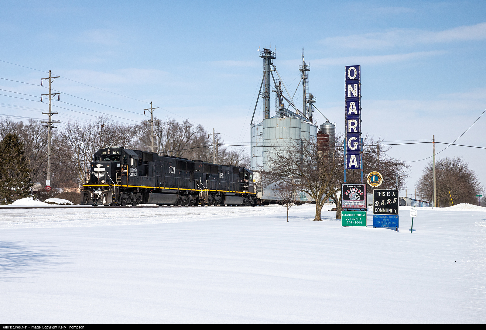 | No mistaking where we are here! CN A408 heads through Onarga at track speed with a duo of IC SD70's leading. Onarga was home to Allan Pinkerton's, the founder of Pinkerton National Detective Agency, weekend estate. |