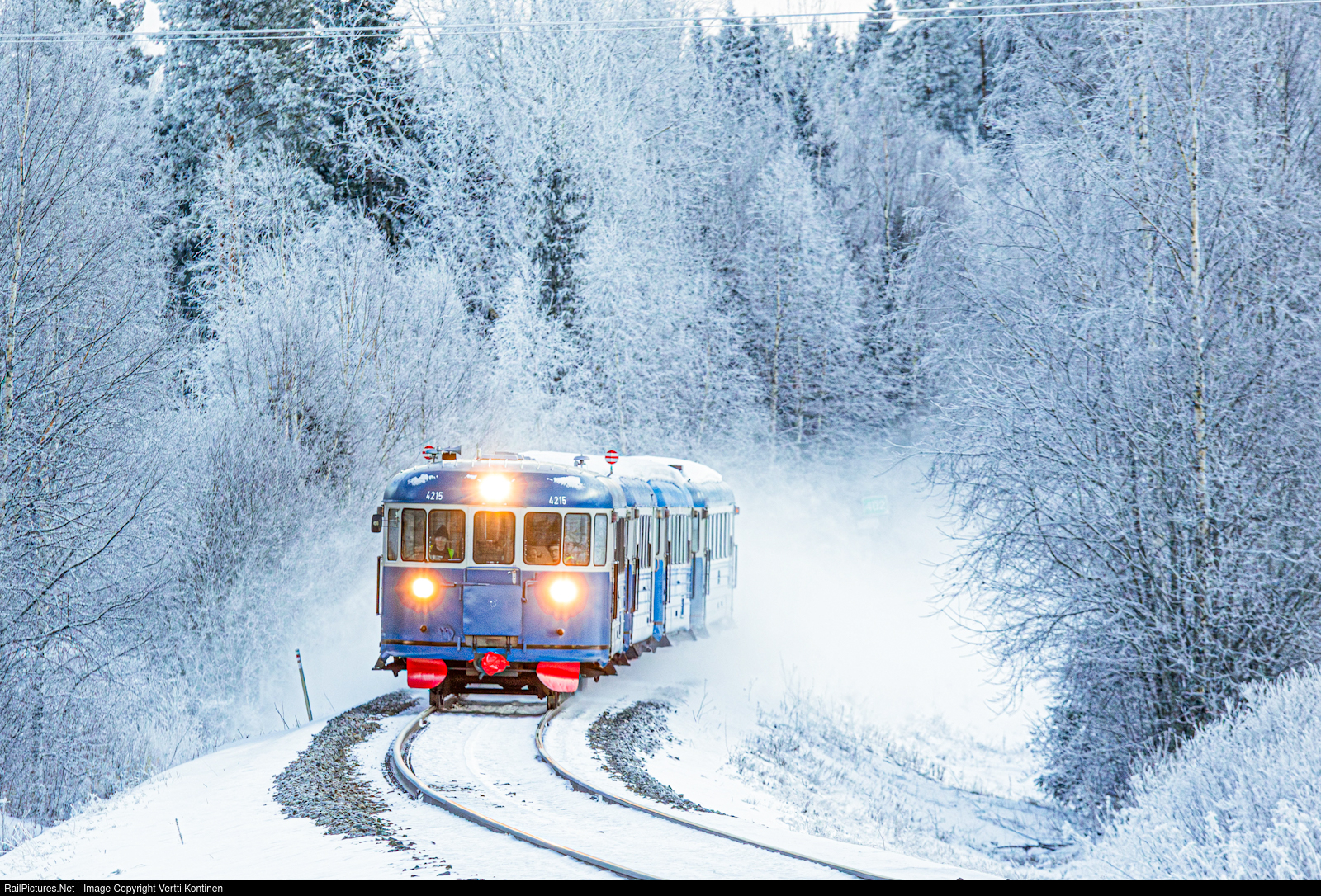 | Haapamäen Museoveturiyhdys ry Dm7 diesel railcars travelling to Seinäjoki where they will spend the winter in a roundhouse rented for essential maintenace over the winter. The roundhouse at Haapamäki isn't heated, so doing repair work can be challenging in freezing tempatures. Here the three Dm7 railcars and an unpowered baggage car are seen in the middle of a winter wonderland in Koura, Seinäjoki as they near their destination as train V 12921. |