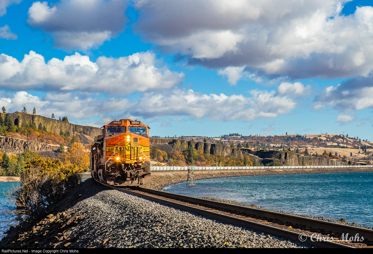 | After setting out a car with a hot bearing blocking the line in Bingen, a late BNSF C44 9W no. 4668 rolls a Westbound grain train over Rowland Lake.
