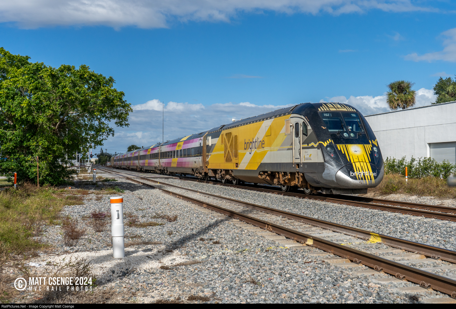 Brightline SCB-40 locomotive 102 is leading the Pink Trainset through Melbourne, FL as train 5737, seen here approaching the grade crossing at Palmetto Ave. |
