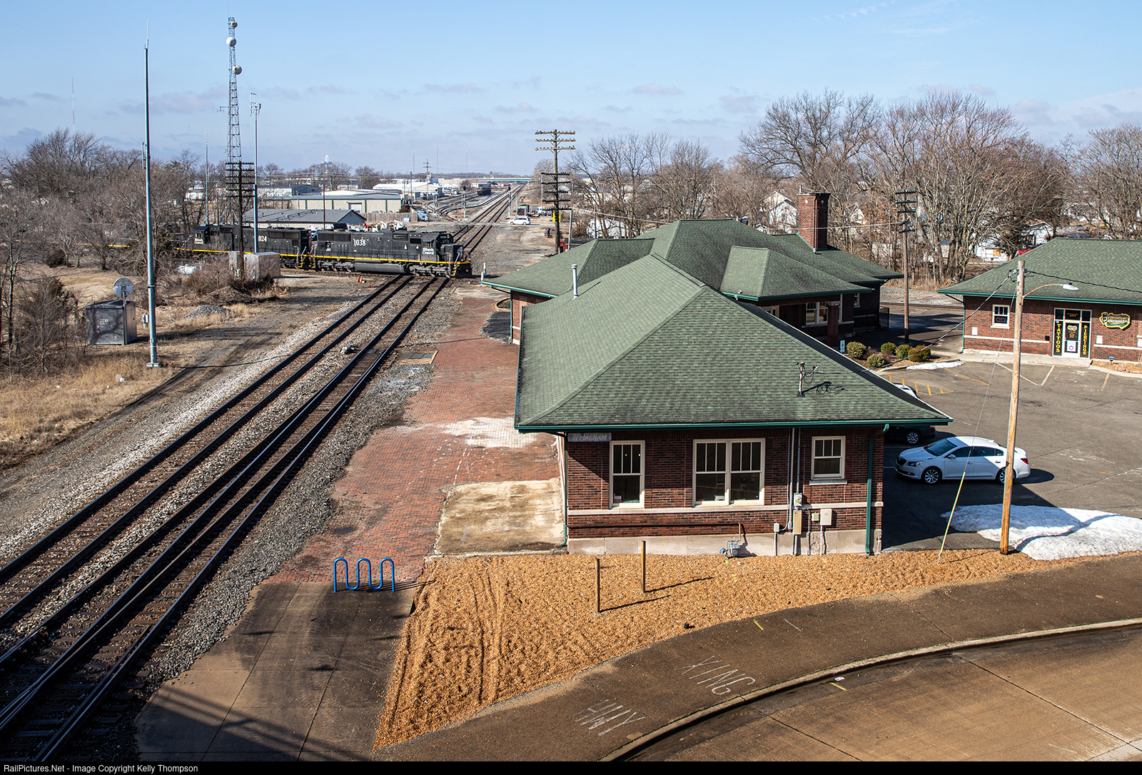| IC 1038 wakes up the city of Effingham as it pounds the CN/CSX diamond. Right in front of us is Effingham's depot. Once served by IC and the PRR, the depot only sees Amtrak on the CN nowadays. |