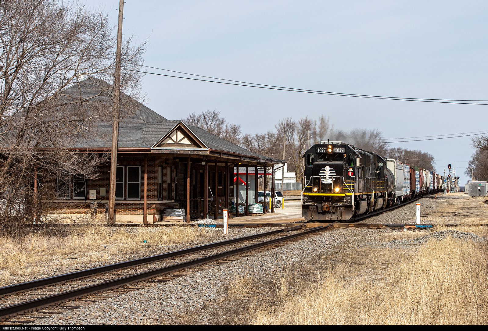 | A408 crosses the diamond at Gilman with IC 1027 leading the way today. The diamond was once an IC/PRR diamond but is now a CN/TPW diamond. To the right is the former depot that now serves as a CN maintenance base. |