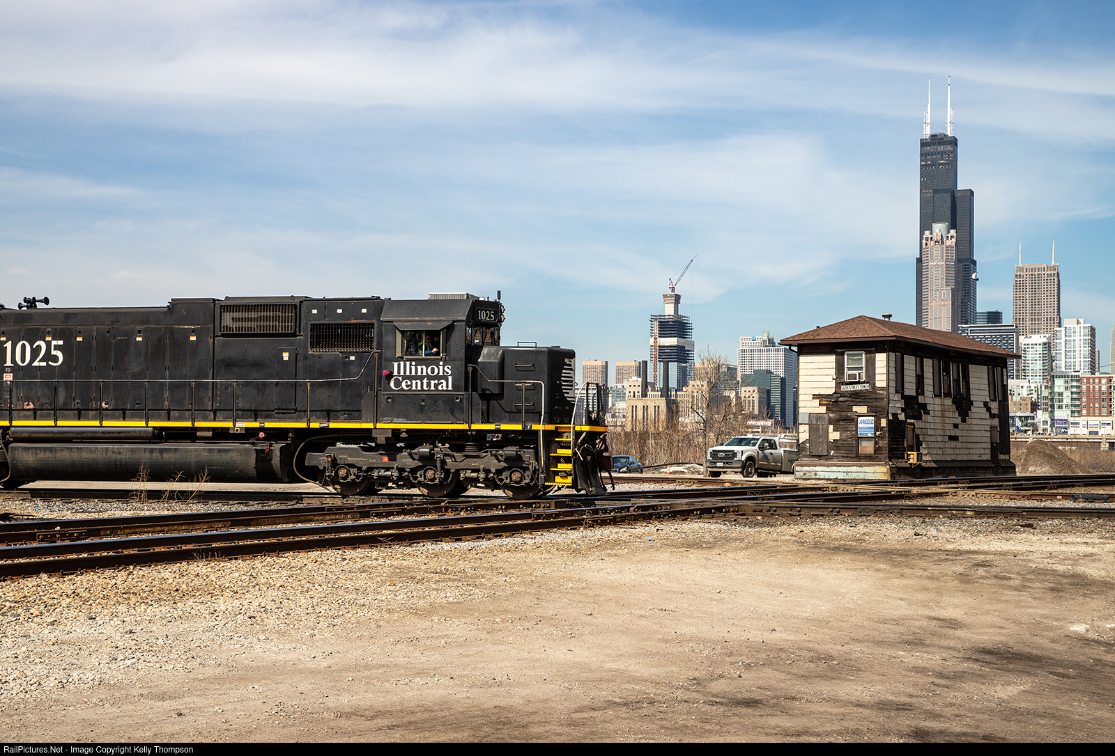 | IC 1025 crosses the diamond at 16th Street with Chicago's beautiful downtown skyline in the background. Still guarding the Rock Island/Illinois Central diamond is 16th Street Tower. |