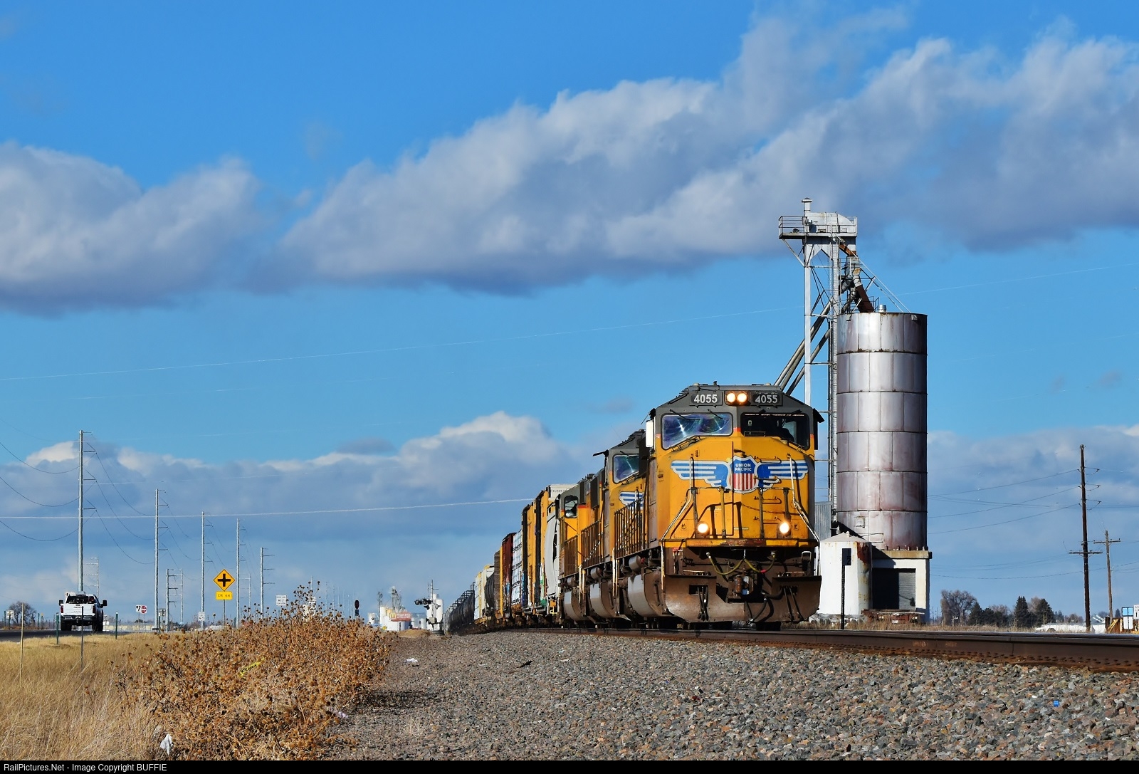 UP 4055 (SD70M) leads a freight past a silo at Gill, Colorado as it heads to Greeley.