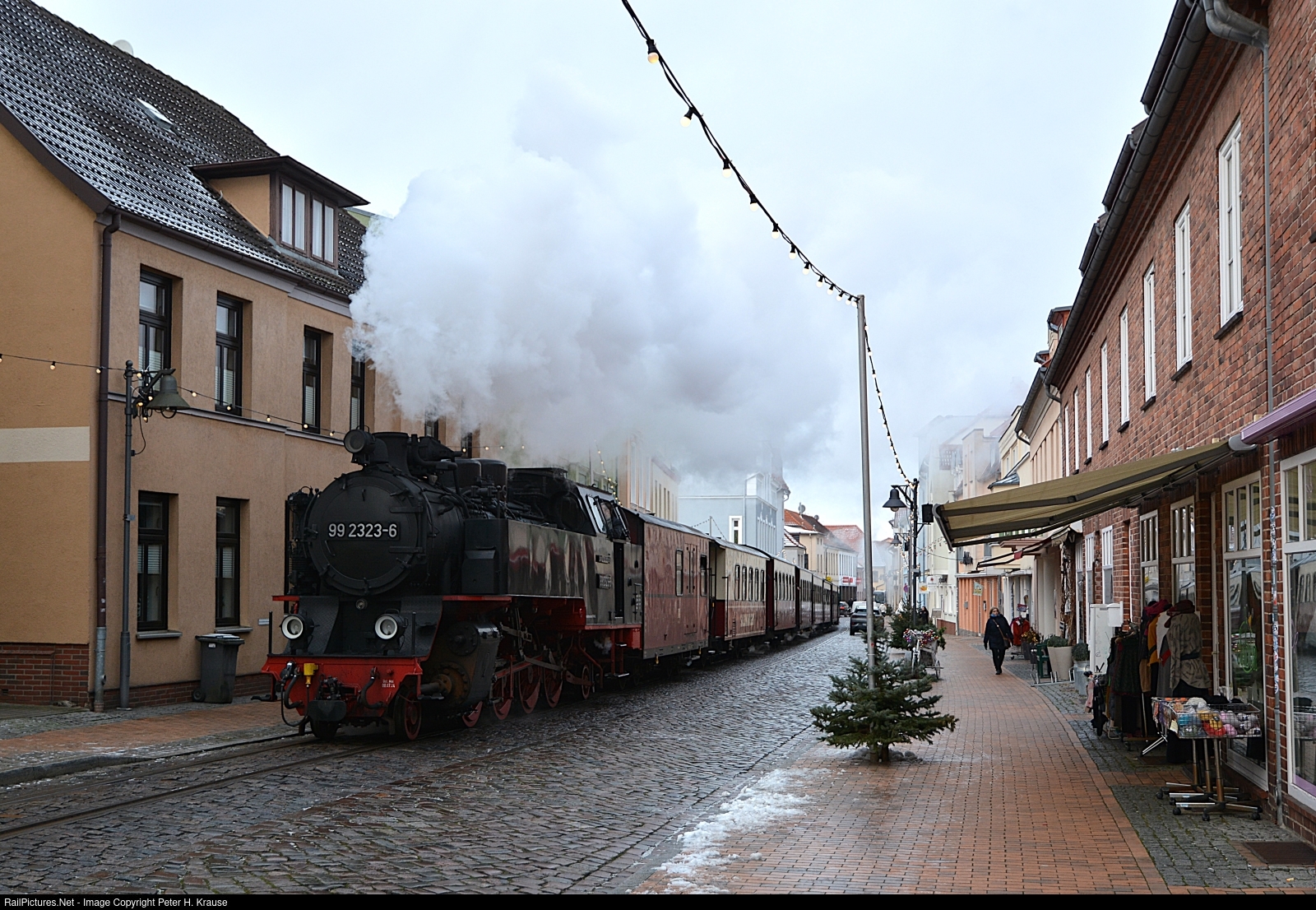 | Some residues of this year's first snowfall and remains of the christmas decoration can be seen, as 99 2323 is running through the empty main street of Bad Doberan. |