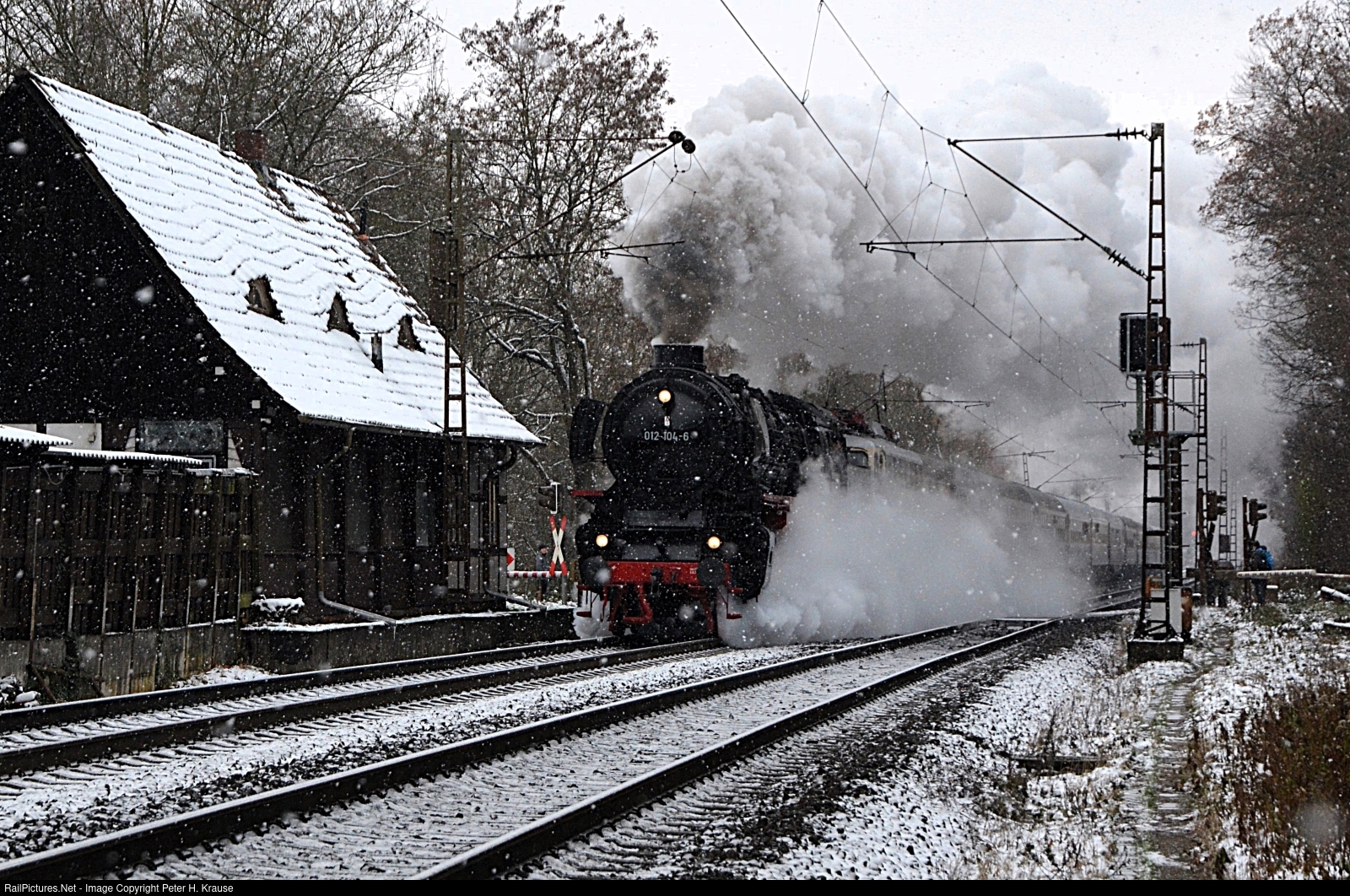 A heavy snow shower is falling, as 012 104 of Faszination Dampf is leaving Braunschweig with a chartered passenger train on its way to Leipzig.