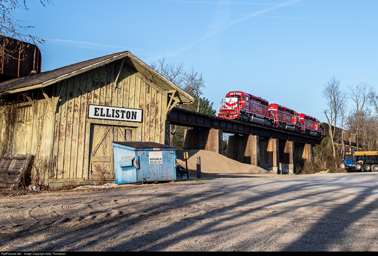 A trio of INRD SD40-2's leads an empty stone train east past the old depot at Elliston, Indiana. Elliston used to be home to a triple crossing between the IC, NYC, and Monon.