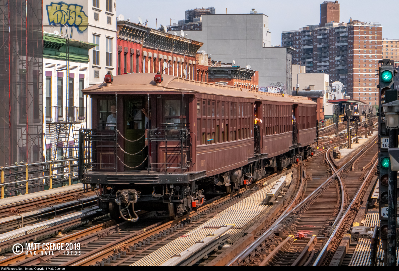 The NY Transit Museum's gate cars saunter down the express track and into the pocket at Marcy Avenue Station, with car 1407 in the lead. This was one of three back-and-forth runs of the gate cars on the Jamaica Line middle track during the nostalgia ride. |