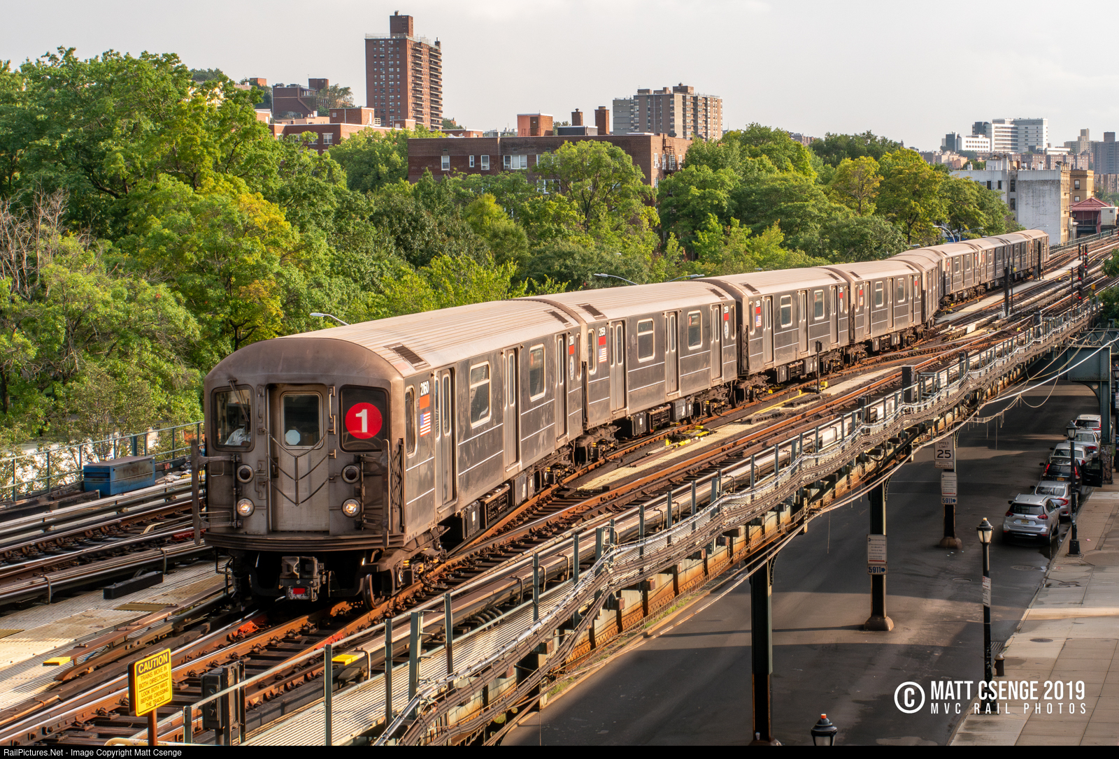 New York City Transit Authority (NYCTA) R62A car 2160 (Bombardier, 1984-1987) is the lead motor on an uptown 1 train seen arriving at its final station, Van Cortlandt Park-242nd St, crossing over all three tracks to enter the stub-end terminal of the IRT Broadway-7th Avenue Line.