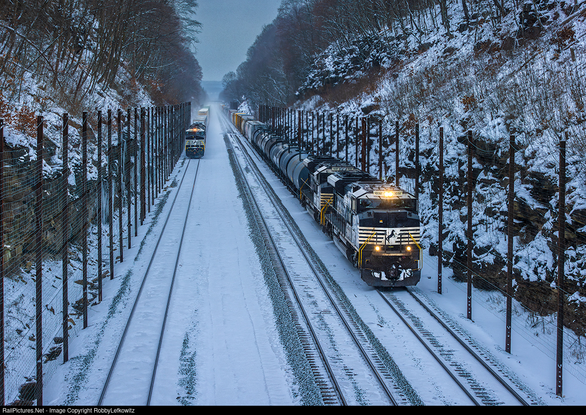 NS 1032 leads manifest train NS 18N eastbound through the snow up the west slope of the Pittsburgh Line grade through Cassandra, Pennsylvania, as it passes eastbound intermodal train NS 20X on track one. |
