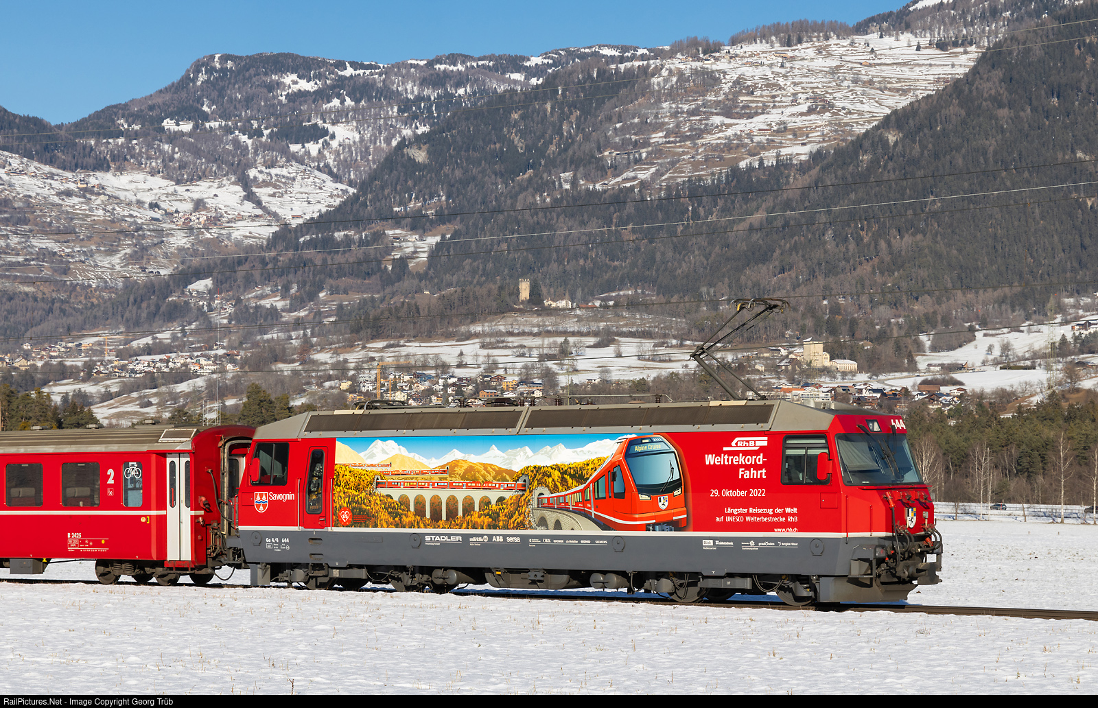 The Ge 4/4 III # 644 "Savognin" of the Rhaetian Railway was built in 1994 by SLM and ABB with 2400 kW and 100 km/h maximum velocity. On June 29, 2022, the locomotive was presented with a new advertising dress for the planned world record run for the longest passenger train on narrow gauge, with the inscription: World record attempt October 29, 2022. After this world record was actually achieved on this date, the address was changed from “World record attempt” to “World record journey”. The locomotive is pushing IR 1140 on line IR38 from St. Moritz via the Albula line to Chur, between Thusis and Cazis. We are in the Domleschg region, rich of castles and ruins of old fortresses. In the background Rietberg castle at Pratval (right, 17/18th century) and the ruins of Neu Sins (13th century) at Canova (left).