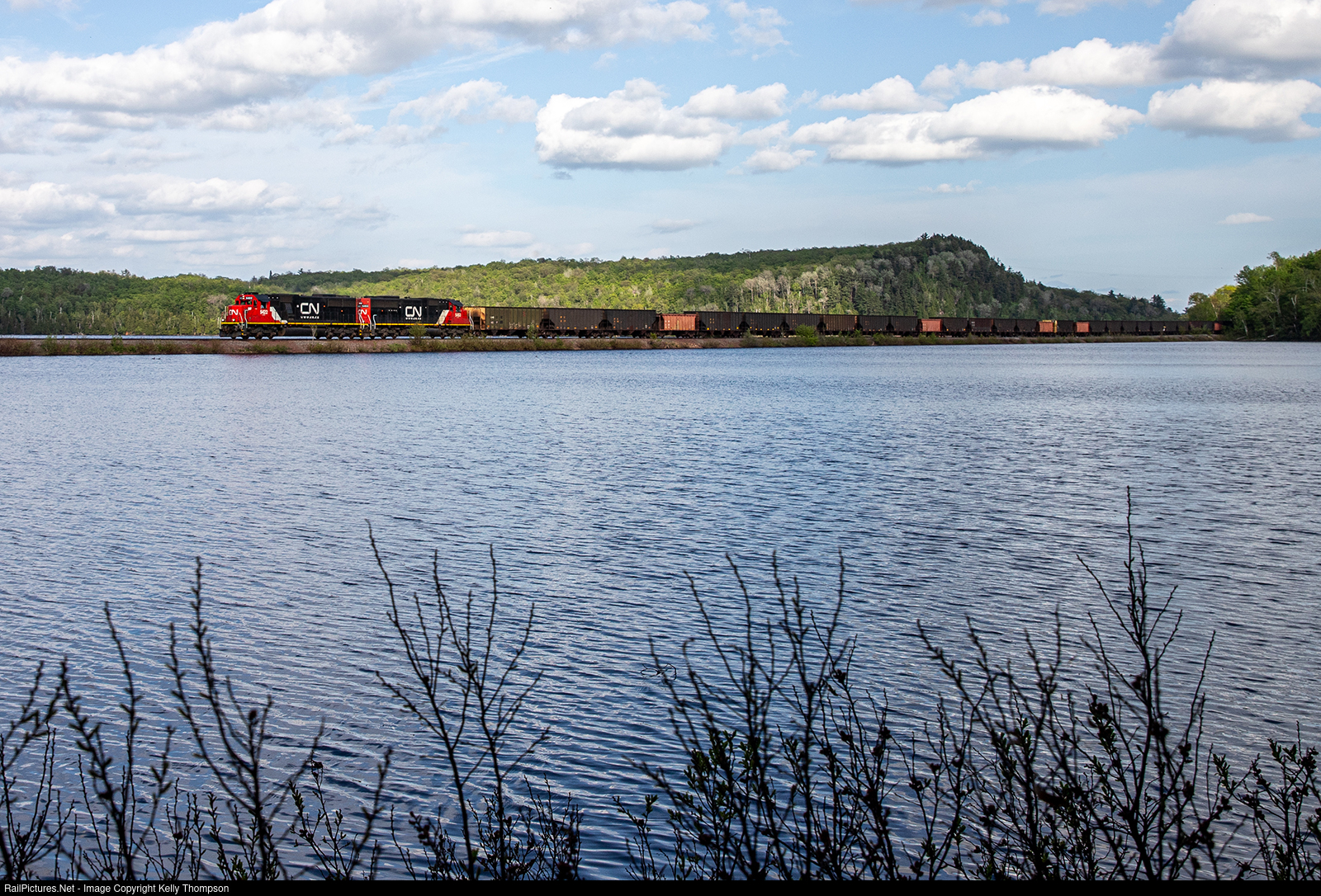| CN 5422 leads U745 along Goose Lake as they head for interchange with the LS&I. I stopped counting ticks after I pulled 10 off on the walk back here. |