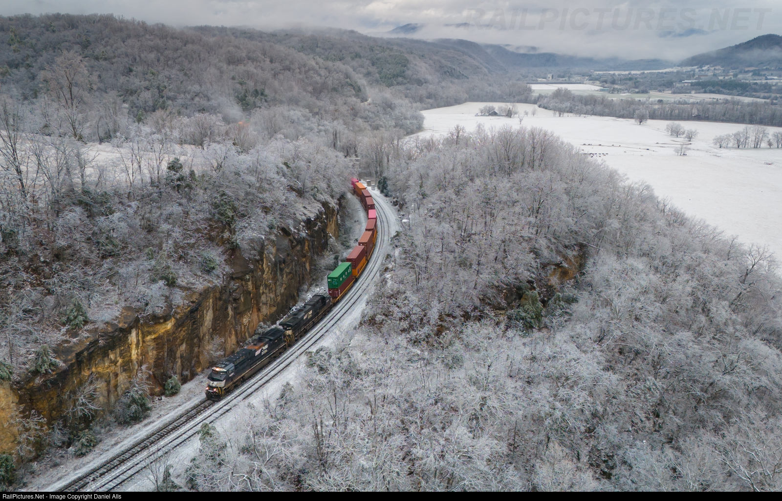 | NS 277 zig zags its way west up Christiansburg grade. It’s seen passing Shawsville Cut, which used to be a tunnel until NS blasted it away. |