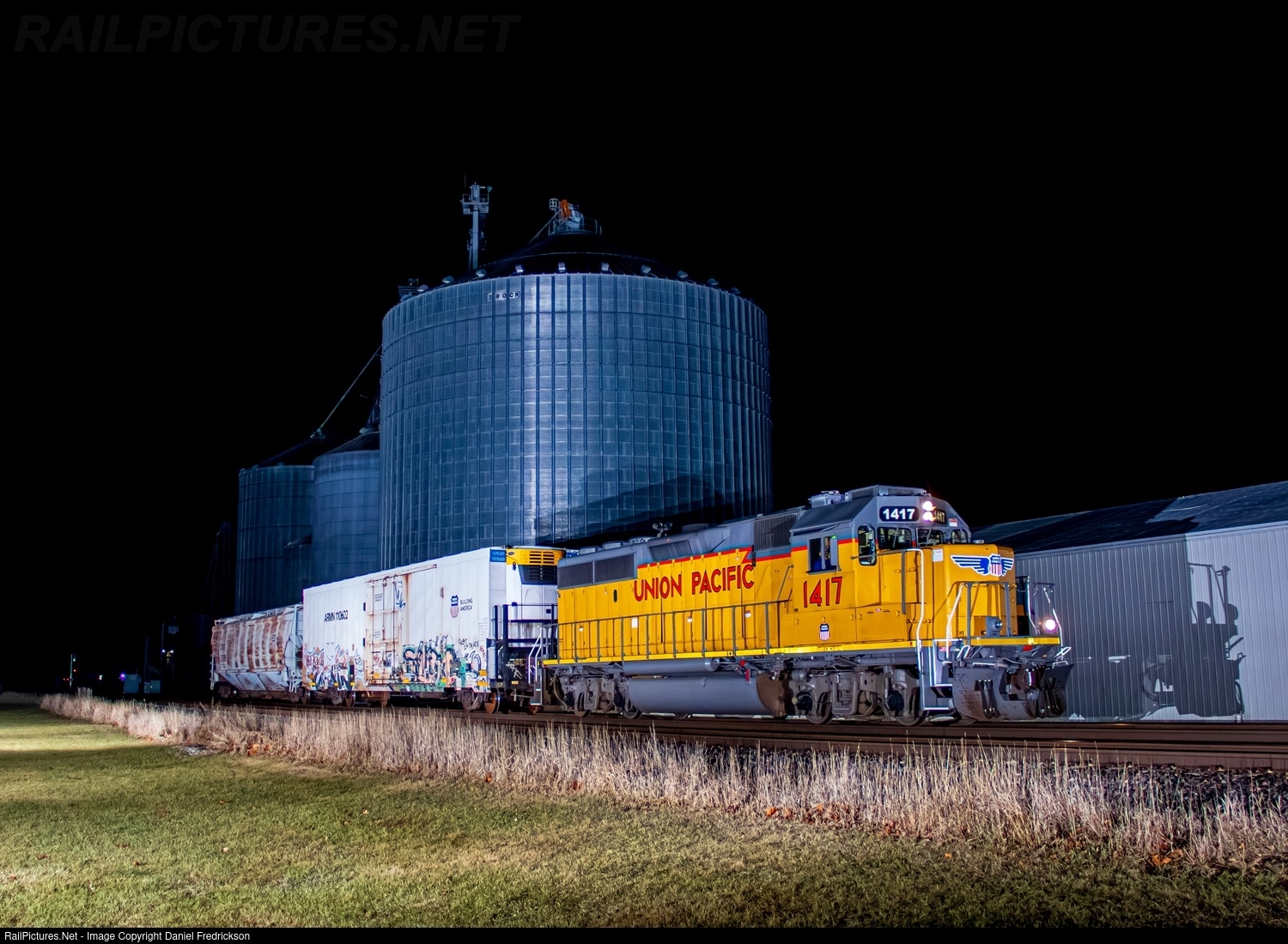 UP 1417, a GP40-2 of SP heritage, leads the LPG04 local from the BJRY interchange in Rochelle with a whopping 2 cars, hustling through Ashton, IL on the way back to Sterling.