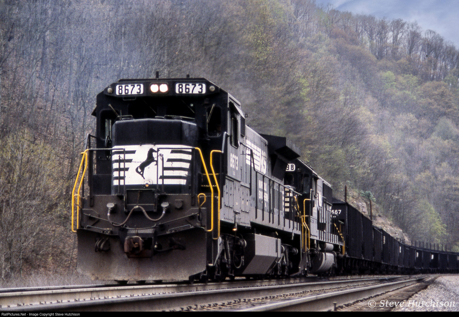 NS 8673 leads a loaded coal train up the eastbound Elkhorn grade at Maybeury West Virginia.