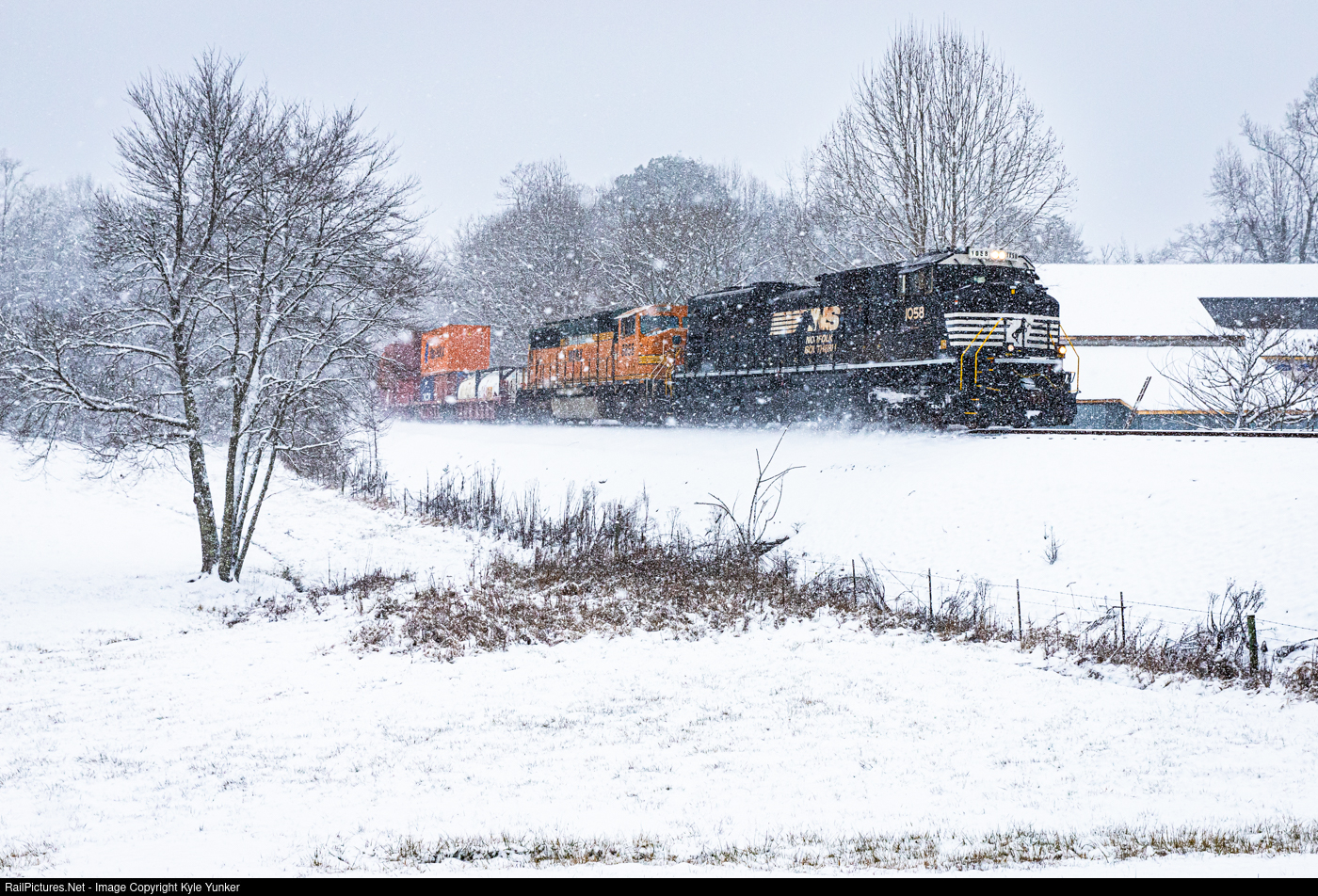 | NS #278 speeds through the snow east of Harriman, TN on its way towards Knoxville and eventually Norfolk, VA. |