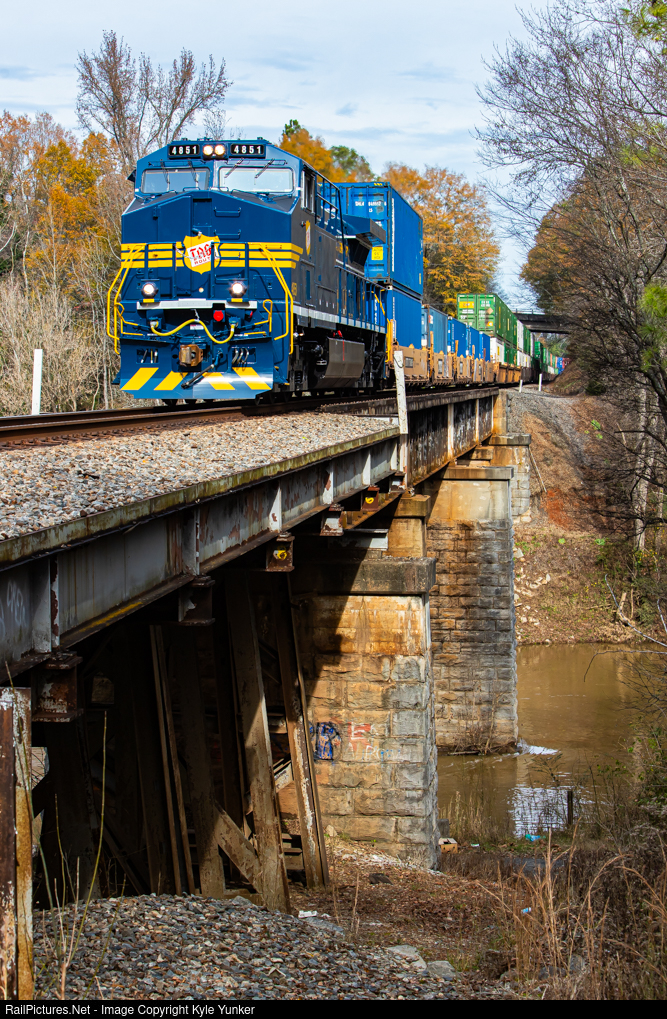 Norfolk Southern's 'TAG' painted heritage AC44C6M leads stack train 29A across the Etowah River