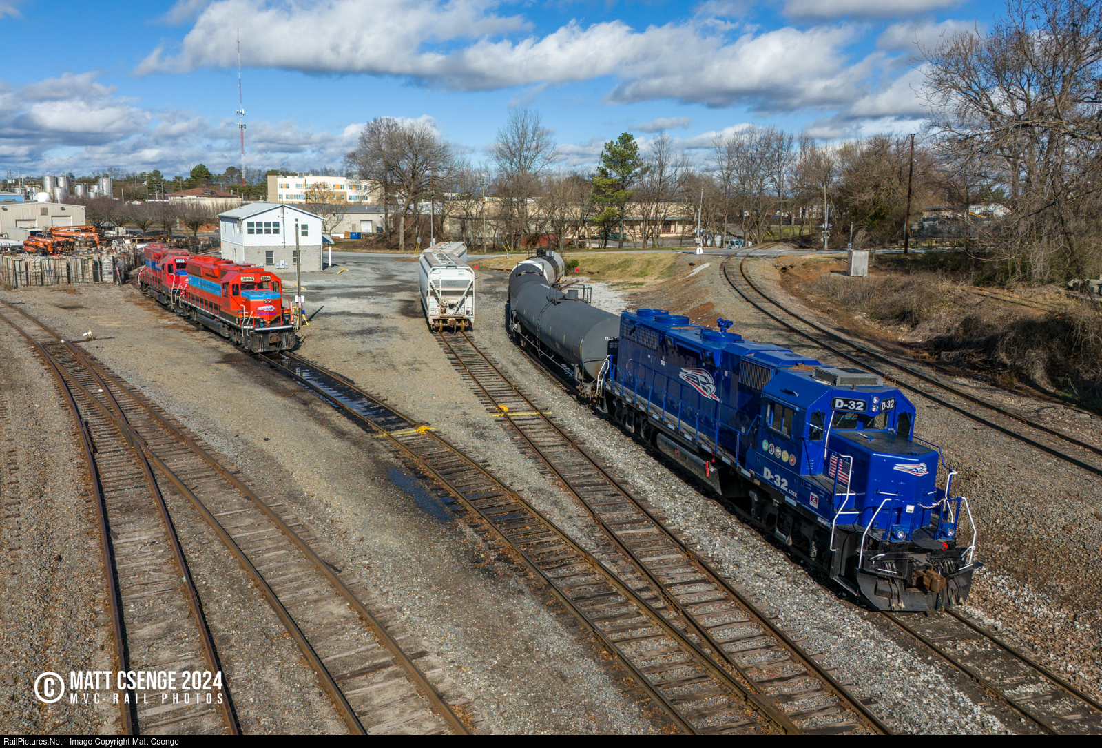 Patriot Power. Georgia Northeastern Railroad (GNRR) leaser GP38s D-32, 3804, and 3805 are seen laid up at the railroad's headquarters in Marietta, GA.