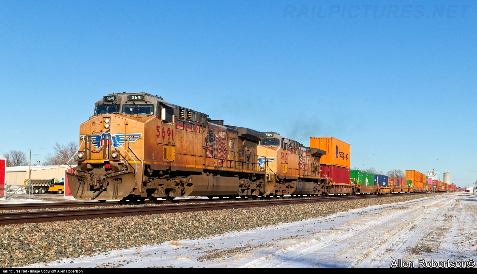 UP 5691 & 5913 lead a westbound stack train.