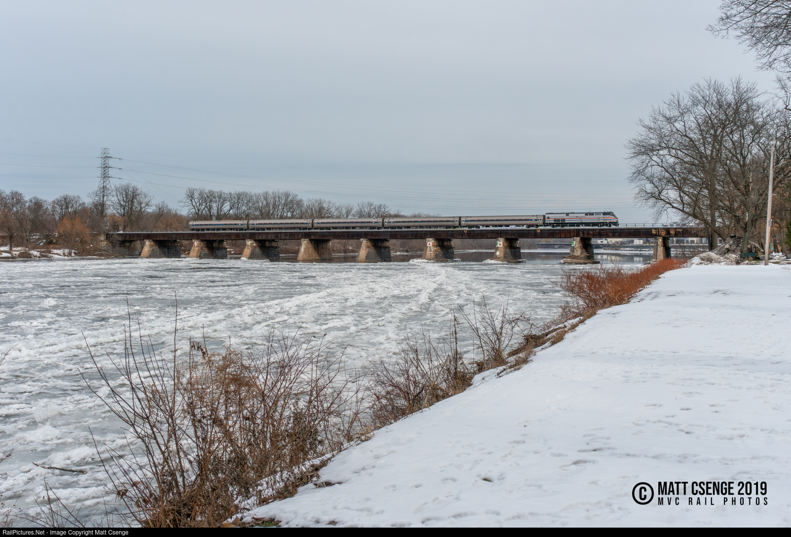 An eastbound Amtrak Empire Service train led by P32AC-DM locomotive 712 crosses the frozen Mohawk River moments before making it's station stop at Schenectady, NY. |
