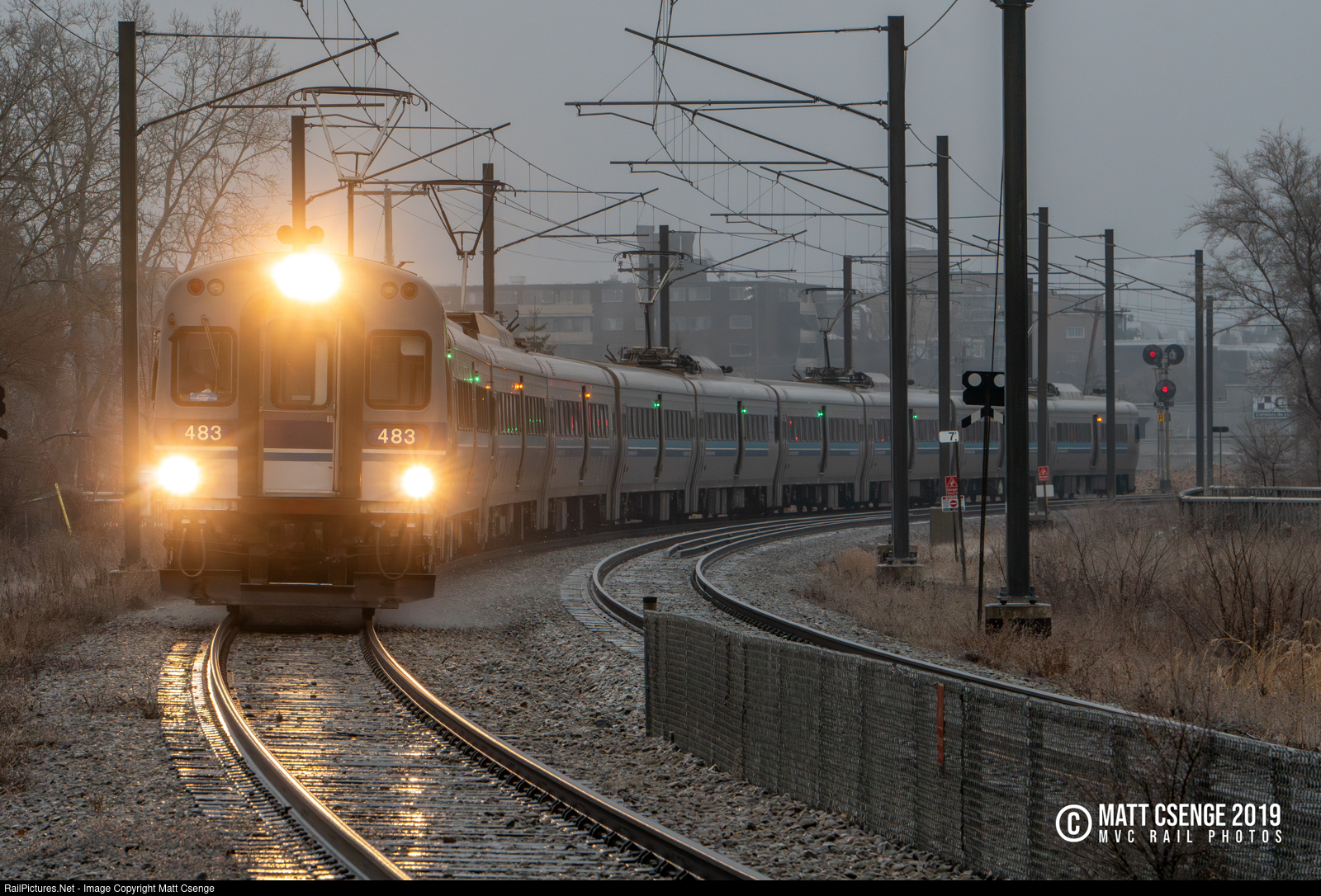 An outbound Deux-Montagnes Line train led by MR-90 car 483 is seen approaching Gare Du Ruisseau on a rainy, icy, and downright nasty day. |