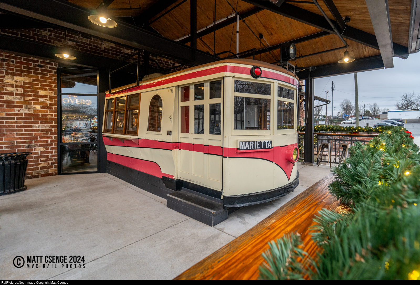 A focal point of the Marietta Square Market food hall in Marietta, GA is their 1922 streetcar on the front porch. The car is of the type operated by the Atlanta Northern between Atlanta and Marietta from 1905-1944. For some time, the car was the "Tiki Trolley," a tropical-themed bar offshoot by one of the restaurants within the food hall. As of December 2024, the trolley has been repainted into its Atlanta & Northern paint scheme.