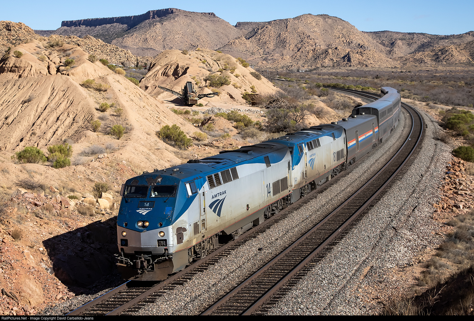 | Amtrak's westbound Southwest Chief is running over 14 hours late as it makes a rare daylight appearance across the northern Arizona region through Hackberry. AMTK 14, like many other P42DCs, is showing its age with rust and nose damage. What was the poster child for Amtrak's long distance trains power, these P42 locomotives will soon be replaced by Amtrak's new Siemens ALC-42 Charges. The Southwest Chief is one of the last remaining to hold out on receiving the Chargers. |