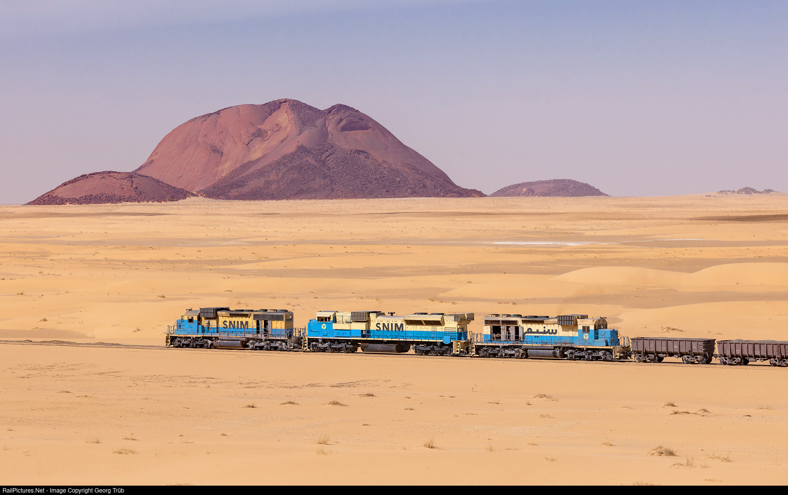 The mauritanian iron ore railway passes Africa's largest monolith Ben Amira, which is 540 meter a.s.l. or rises about 370 meter above the desert. The about 2 kilometer long loaded iron ore train M6 (called "mineralier 6") from the mine near Zouérate to the port of Nouadhibou is near PK 404 between Choum and Ben Amira, pulled by a typical SNIM consist of two SDL40-2 and a SD70ACS. CC # 118, CC # 127 and CC # 113 are in charge of the about 20000 ton train.