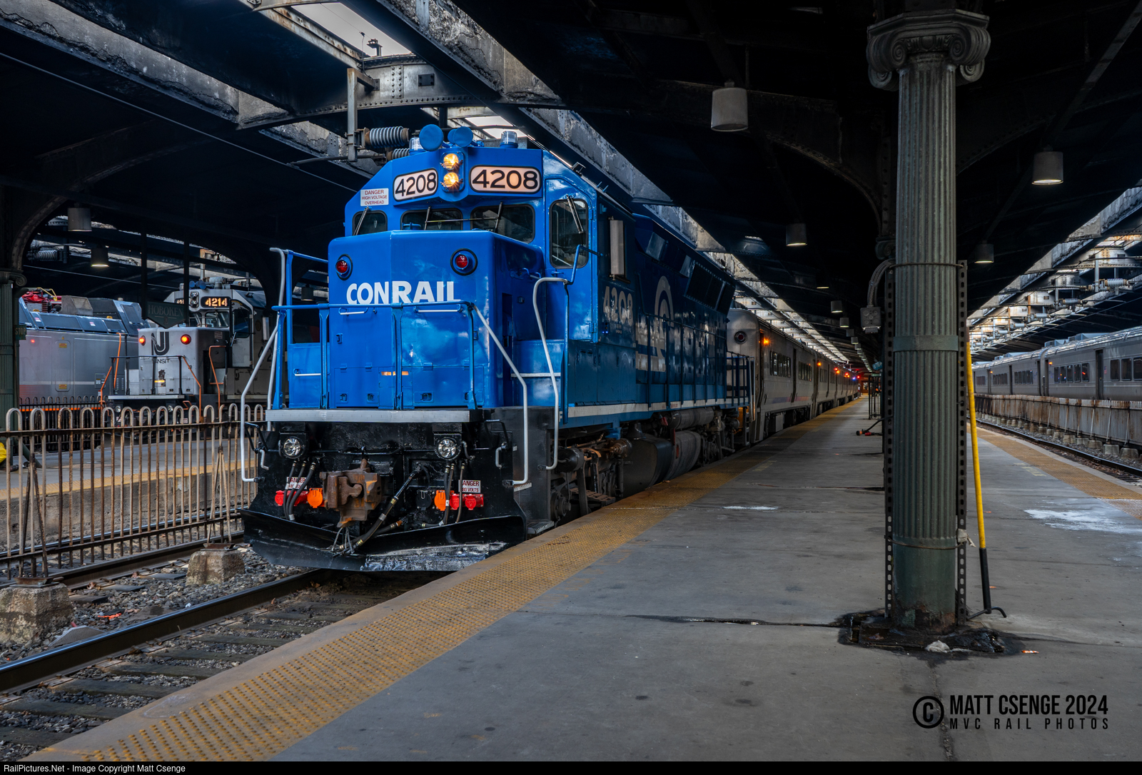 NJ Transit GP40PH-2B no. 4208 is seen idling under the trainshed at Hoboken Terminal, awaiting departure with train 51 to Port Jervis. Though unveiled in its new Conrail heritage scheme back in October, the locomotive had only recently entered revenue service a few days prior. |