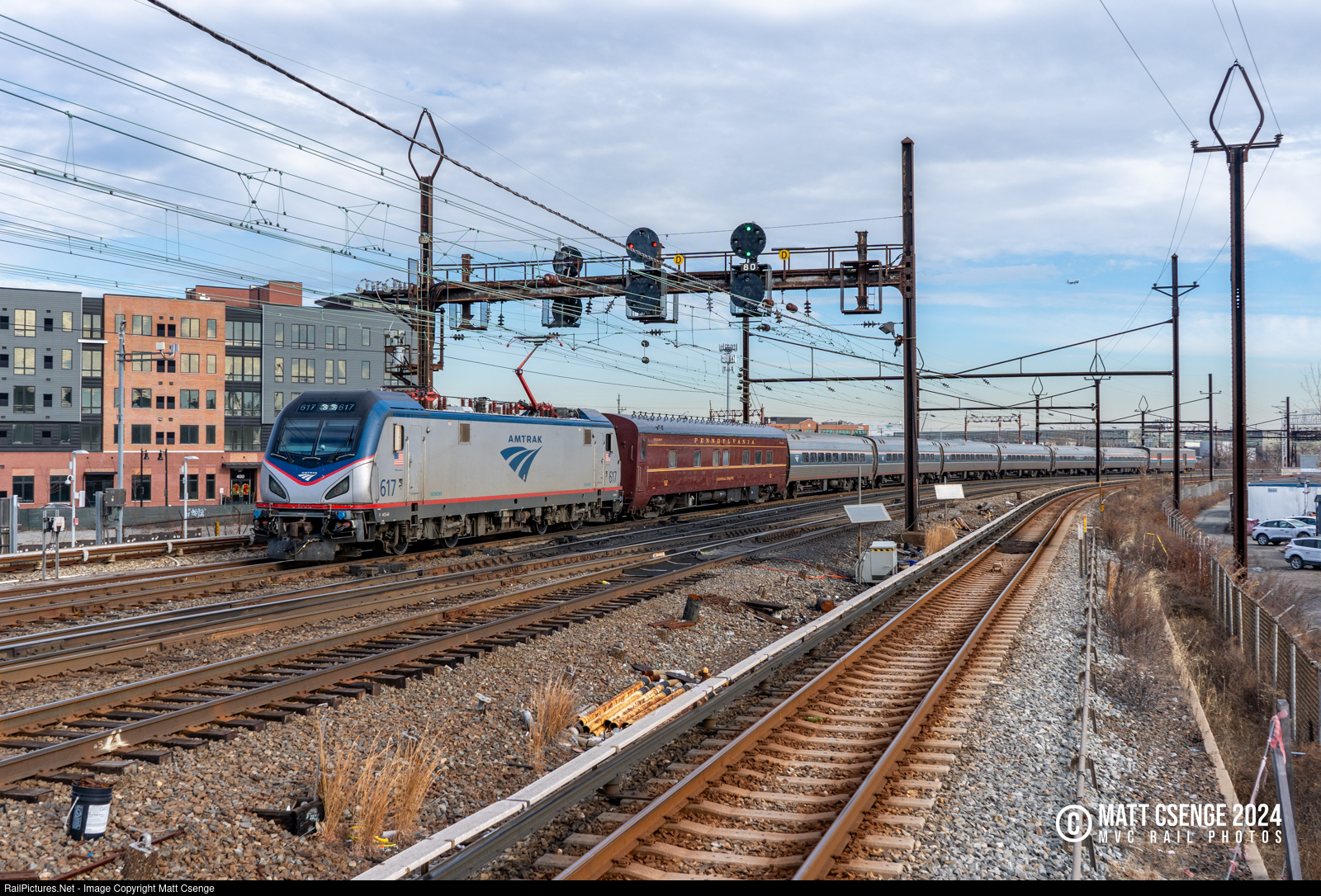 Amtrak ACS-64 no. 617 is seen leading train 43, the westbound Pennsylvanian, through Harrison Station. Second behind the locomotive is the private railcar Colonial Crafts, returning to Philadelphia after a charter to Miami and back.