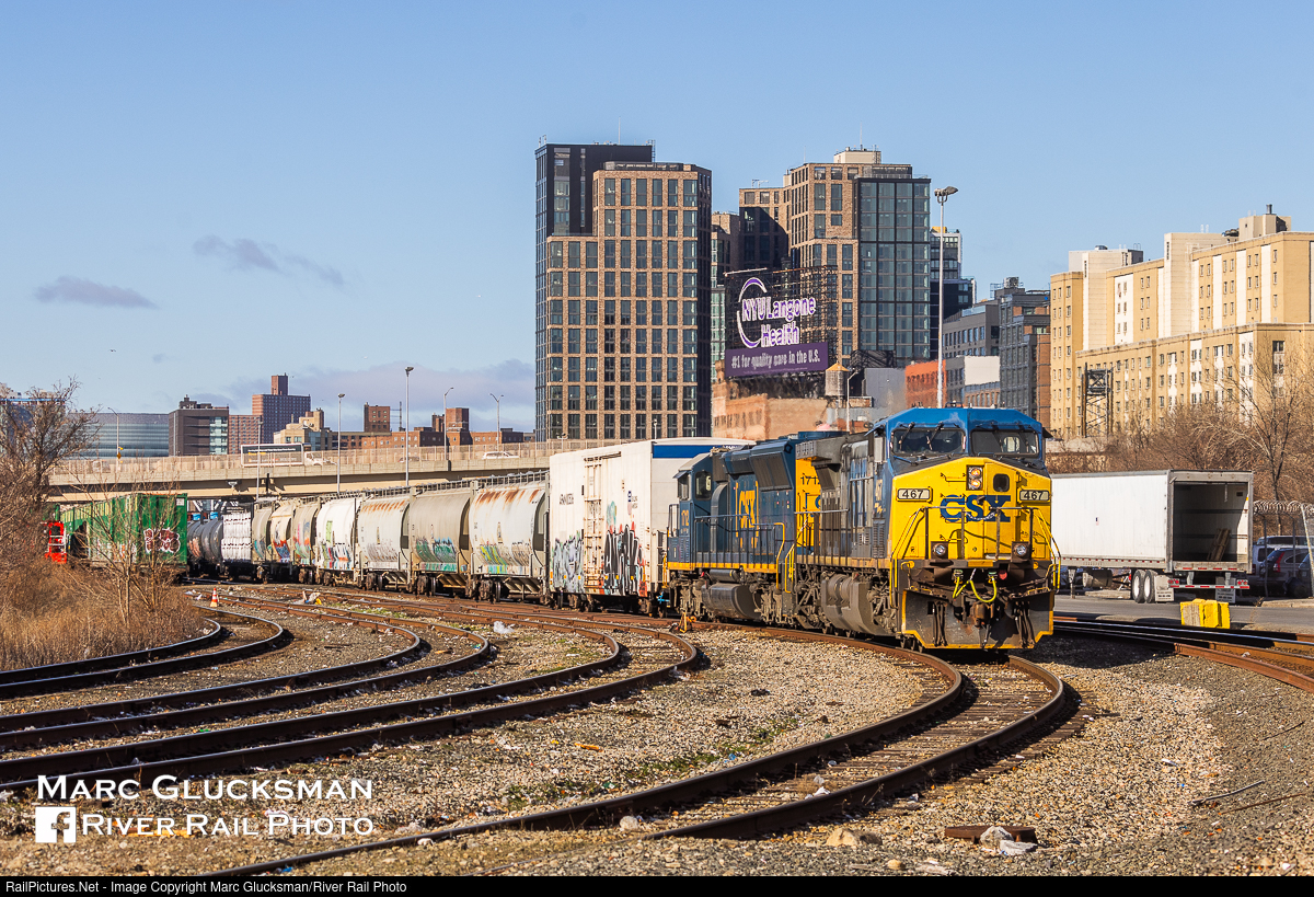 New Sign At Harlem River Yard. A late running CSX M701-08 made the trip on the Hudson Line from Croton-On-Hudson, New York to Oak Point Yard in the Bronx, New York in daylight on Thursday, January 9, 2025 with CSXT 467 (AC44CW) leading CSXT 1712 (SD40E) and a substantial consist on sunny and windy winter's day. The yellow edges of the notched plow on the lead unit indicate that it has clearance for movement through third rail territory. This train, and its north/westbound counterpart M702, are the only Class I freight trains that serve New York City. Once the home of the History Channel sign, the building adjoining the Harlem River Yard in the Bronx, New York now features an advertisement for NYU/Langone Health System.