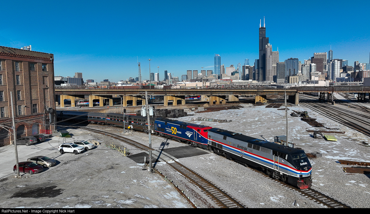 | The Lake Shore Limited makes its way through Canal Street as it prepares to make its moves to to the yard. The Phase III and "Connecting America for 50 Years" heritage units teamed together this morning. |