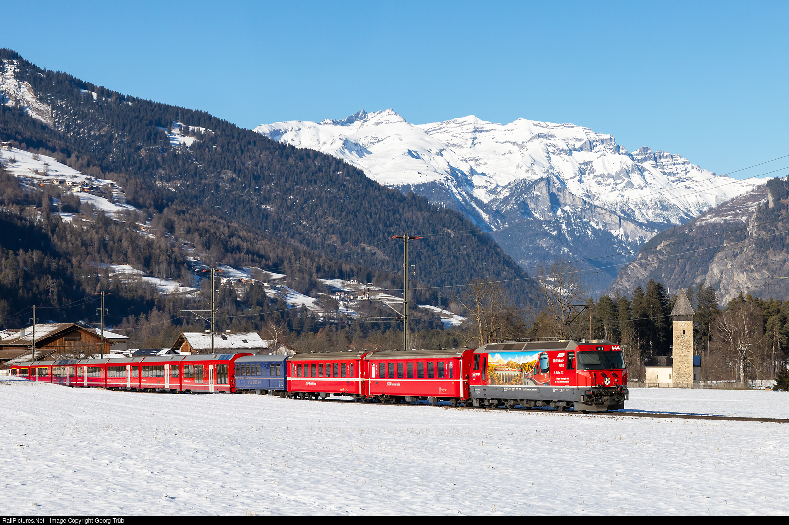 | Ge 4/4 III # 644 "Savognin" of the Rhaetian Railway in the paint scheme for the world record of the longest narrow gauge passenger train, is shoving the IR 1140 of the line IR38 from St.Moritz to Chur between Thusis and Cazis. The train is reinforced with two second class standard cars type II and the blue GOURMINO dining car WR # 3810. On the right is the Sogn Martegn church from the 9th century, in the background in the mountain range the Ringelspitz. |