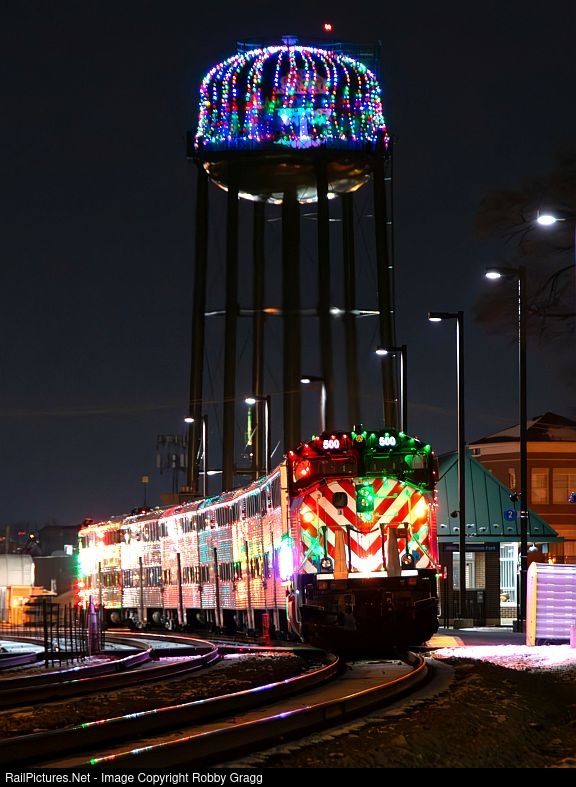 Metra 500, the RTA heritage unit, makes a stop at Elmwood Park with the Milwaukee District Holiday Train. The Elmwood Park water tower is also lit up with Christmas lights.
