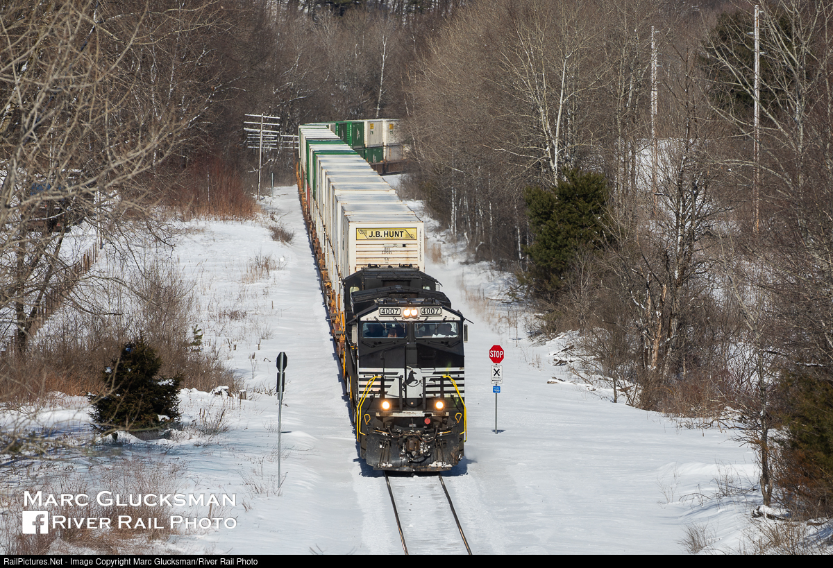 | Hunting In The Snow. On the beautifully bright but frigid afternoon of Saturday, March 23, 2019, Norfolk Southern Train 205 was approaching the Country Road 56 overpass in Schenevus, New York with NS 4007 (AC44C6M) leading a long train of containers with a J.B. Hunt block up front. The low temperatures allowed the snows of the previous days to stick and coat the ground around former Delaware & Hudson Railway line. |